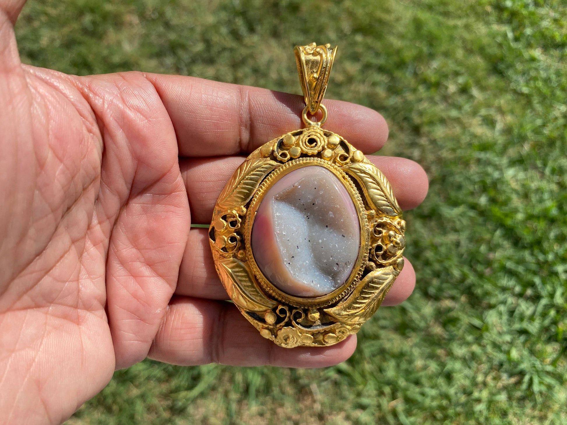 Large Agate Druzy Pendant, Non Tarnish Brushed Gold Overlay, Natural Gemstone Pendant, Healing Crystal, Ethnic Jewelry, Luxury Pendant