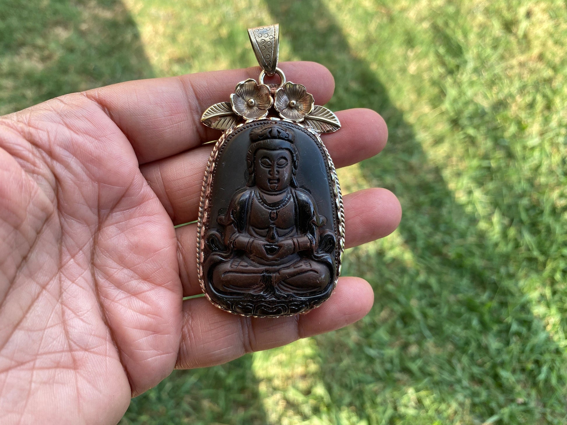 Large Black Obsidian Buddha Tibetan Silver Pendant, Protection Pendant, Yoga Pendant, Unisex necklace, Bodhisattva Amulet Talisman