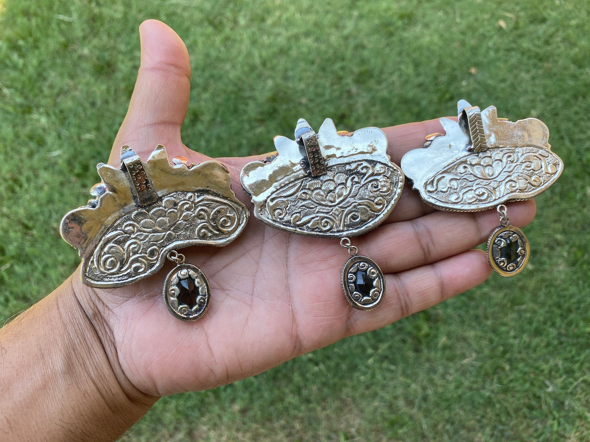 Measurement: Left Pendant: approximately Length 70 mm (measuring from bail to bottom), width 60 mm from the widest side, bail size: 8 mm and weight about 35.10 gm.Center Pendant: approximately Length 80 mm (measuring from bail to bottom), width 60 mm from the widest side, bail size: 8 mm and weight about 39.30 gm.Right Pendant: approximately Length 75 mm (measuring from bail to bottom), width 60 mm from the widest side, bail size: 8 mm and weight about 34.00 gm.DA: 0550Disclaimer: Items are handmade so please note: Each item is unique may have some small imperfections. There can be a slight difference in actual color than shown in picture.Images may appear enlarged or smaller. Please refer to the measurements given. ✤ Keep in mind:1. Product VarianceAs the jewelry is handmade in nature, the items may experience variance in texture, shape, color, and finish. This also comes with some imperfections, which sets them apart from jewelry made in a factory – that being said please read the description thoroughly and view the pictures before you make your final purchase. As always, please don’t hesitate to ask us if you have any questions as we are more than happy to provide you with utmost quality assurance.
