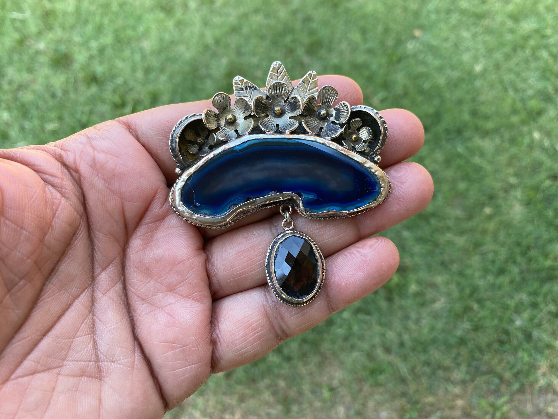 Large Blue or Pink Slice Agate With Smoky Quartz Gemstone Tibetan Silver Pendant, Flower Design Pendant For Necklace, Ethnic Jewelry