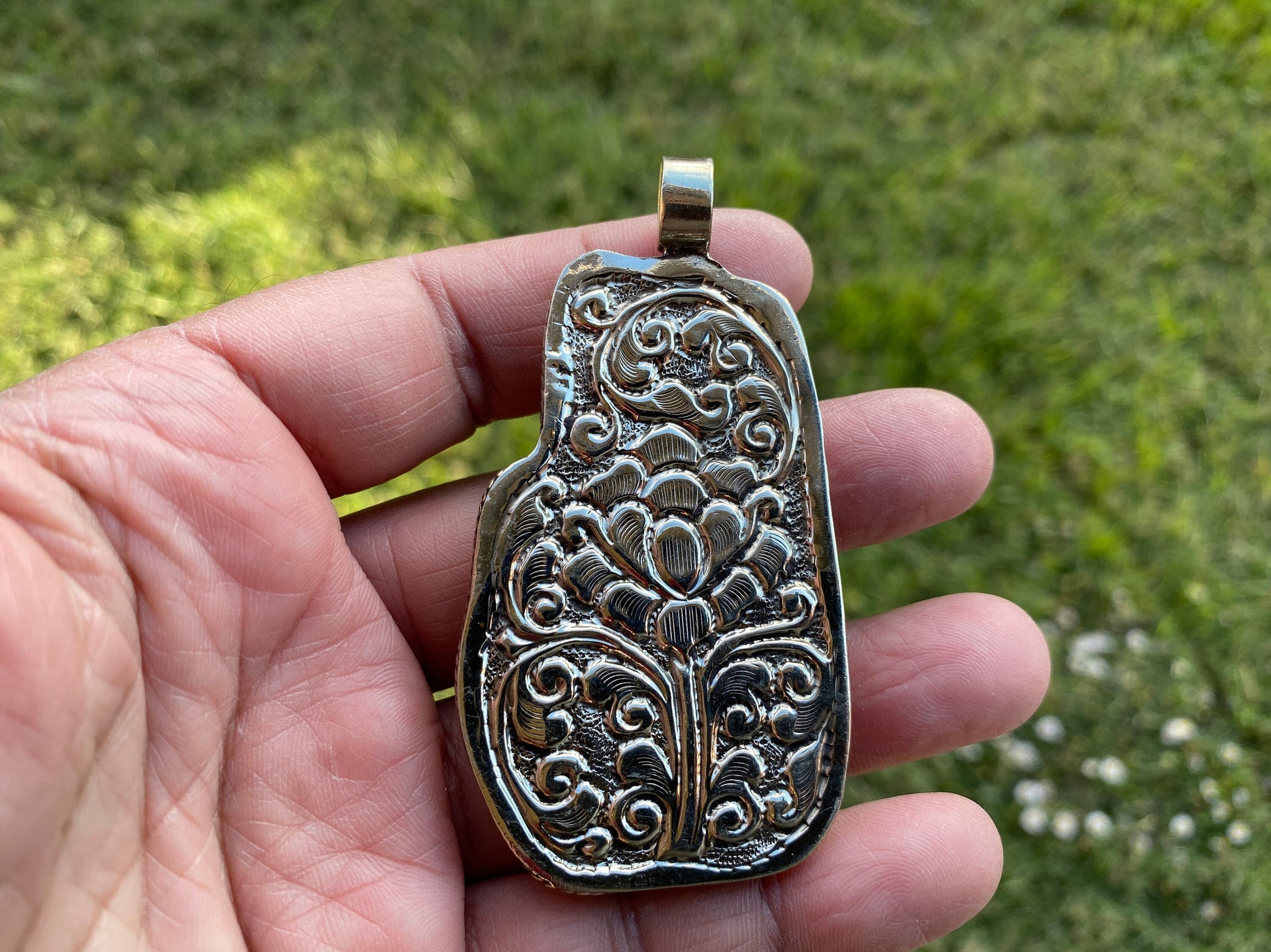 Large Buddha Hand Tibetan Silver Pendant made with Hand carved Buffalo bone with floral designs on the back side of the Pendant. This Tibetan designs pendant is handmade in Nepal and adorned by a beautiful pendant. Perfectly Ethnic in style, these Tribal beauties come from the Himalayas. Beauty of this pendant that is unmatched as they are handmade and are one of a kind. With the nature of them being handmade, each product is unique in its own right and no two products are the exact same.