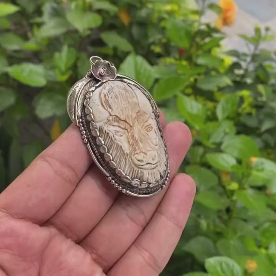Large Buffalo bone pendant with Carved bull face on Bone, Natural Tibetan Silver Pendant, Pendant for daily wear, Unisex healing pendant (Two).