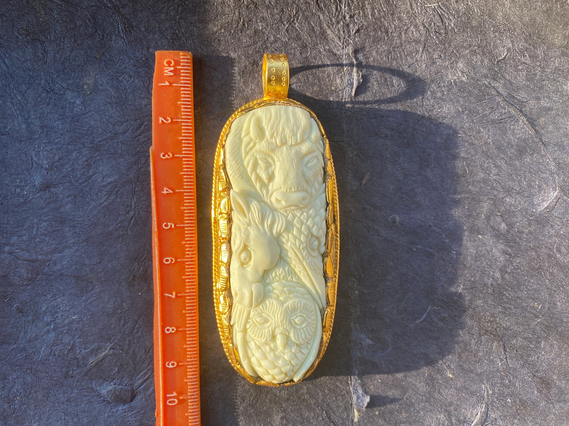 This Gorgeous hand carved buffalo bone pendant made with 18K Matte Gold Overlay over Brass with anti tarnish finish with a remarkable detail of carving. Hand-carved Dragon design on the back side of Pendant. This Tibetan designs pendant is handmade in Nepal and adorned by a beautiful pendant. Perfectly bohemian in style, these tribal beauties come from the Himalayas. Beauty of this pendant that is unmatched as they are handmade and are one of a kind. With the nature of them being handmade, each product is unique in its own right and no two products are the exact same.