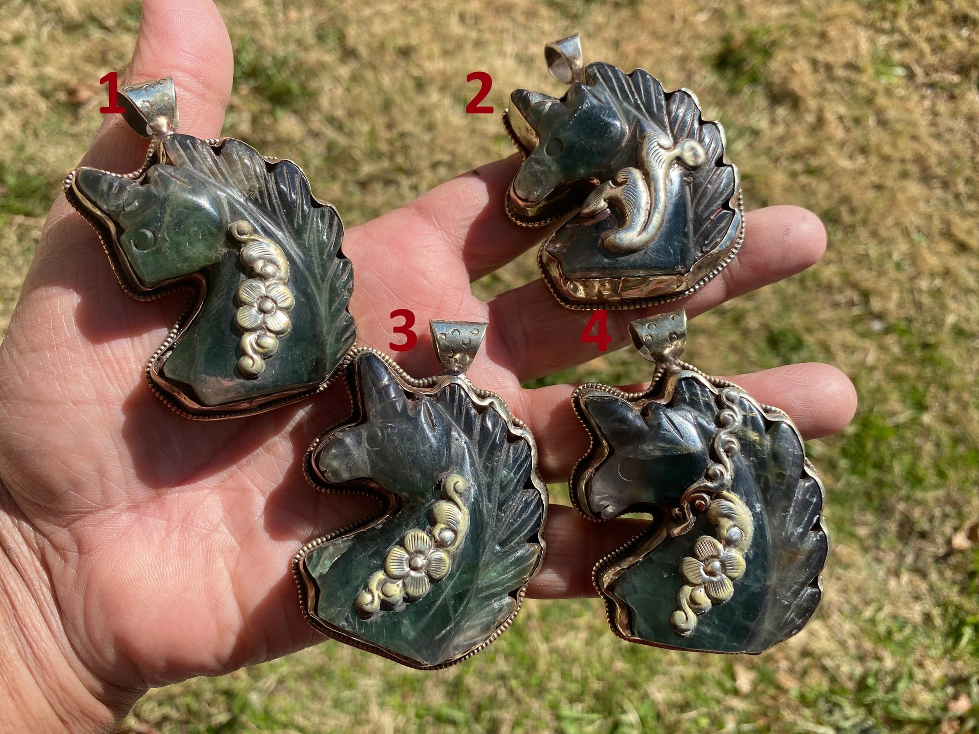 Large Carved Green Aventurine Horse Head Tibetan Silver Pendant, Horse Jewelry, Animal Lovers Jewelry, Metaphysical Stone Pendant, Unicorn