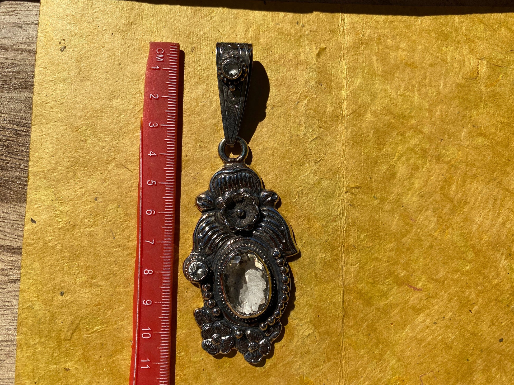 Large Citrine Tibetan Silver Pendant, White Topaz Gemstone Pendant for Necklace, Jewelry from Nepal,Christmas Gift,Ethnic Hill Tribe Jewelry