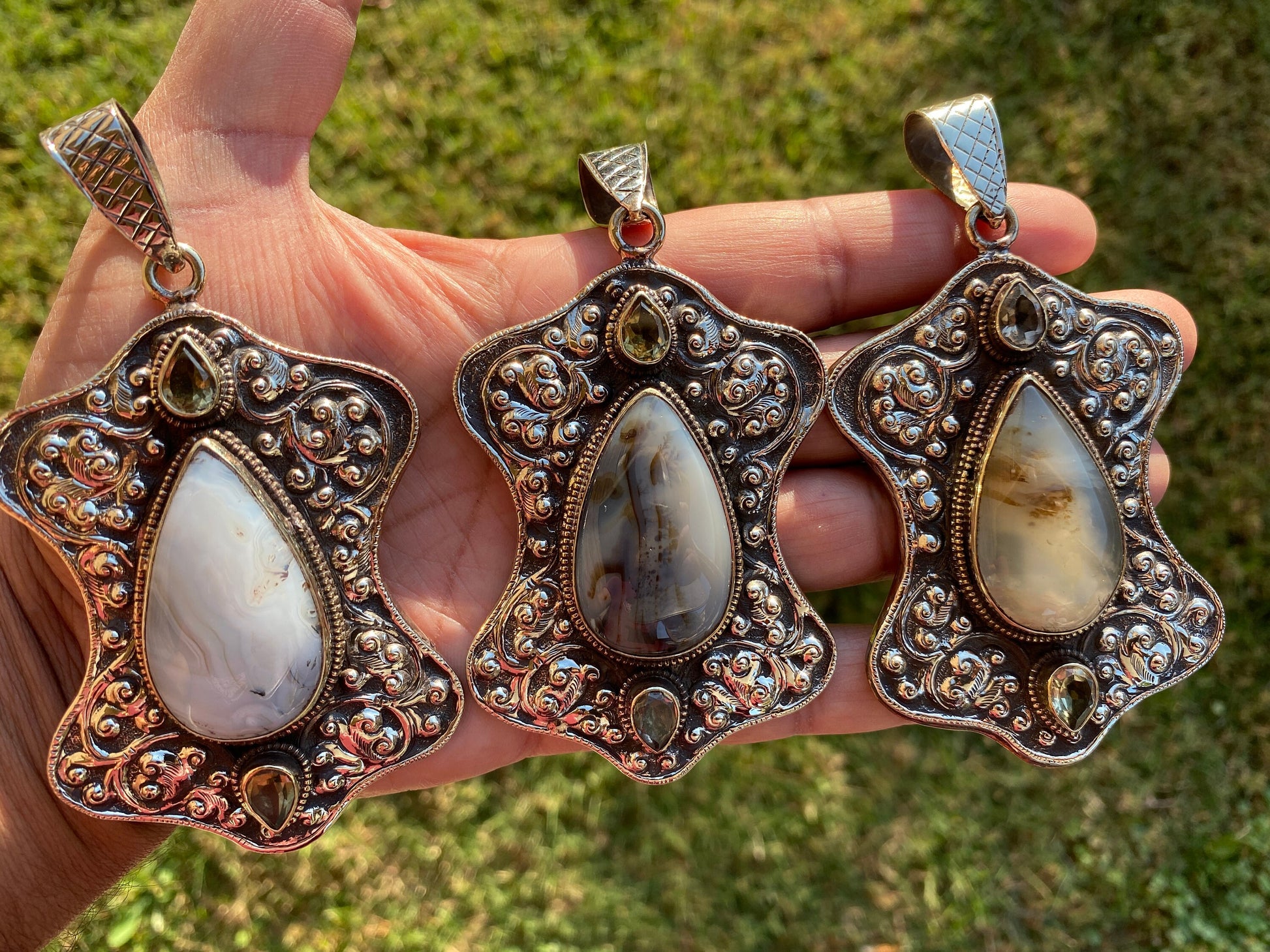Large Dendritic Agate Pendant, Tibetan Silver Pendant, Citrine Gemstone, Tibetan Pendant, Natural Stone Pendant, Hand Carved Ethnic Pendant