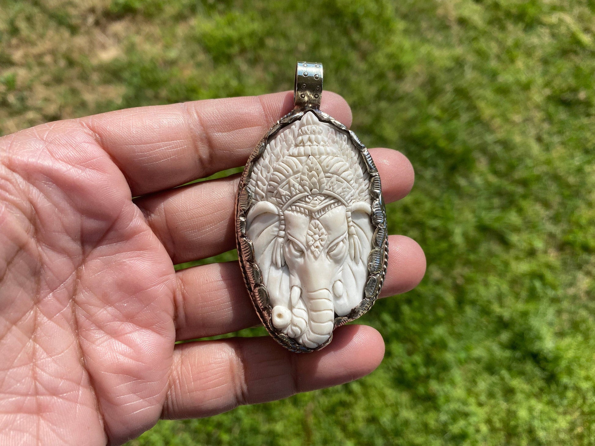 Large Ganesh Hand carved Bone Tibetan Silver Pendant, Buffalo Bone, Yoga Pendant, Religious Spiritual Pendant, for Men or Women, Hindu God