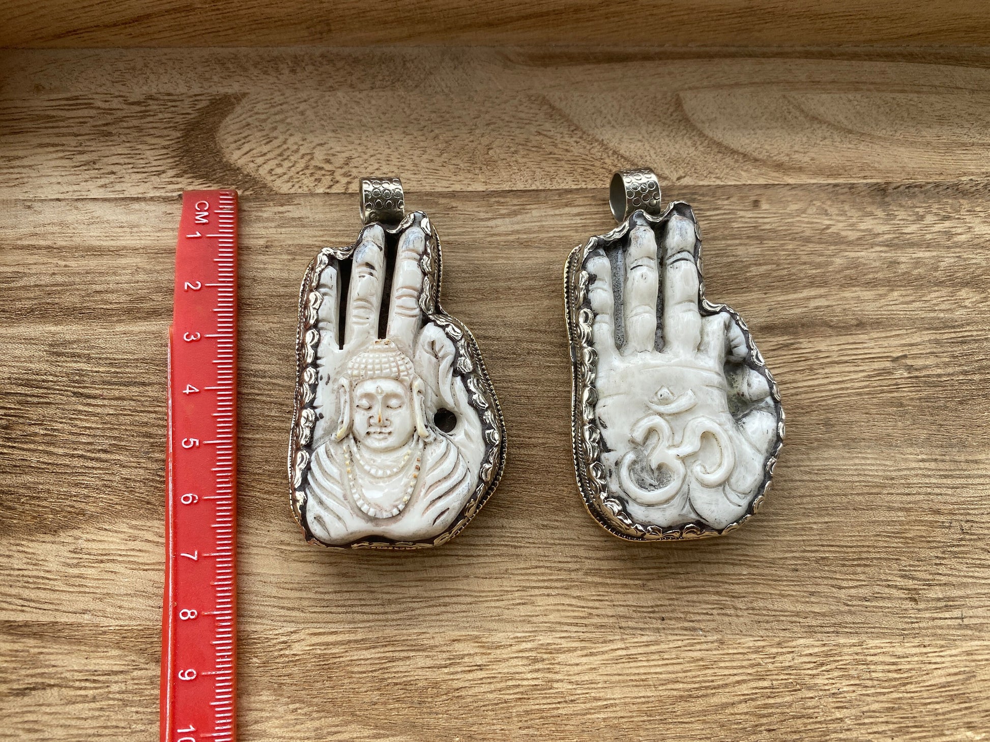 Large Hand Carved Bone Hand of Hamsa Pendant, Bone Jewelry, Hamsa Pendant, Om Symbol, Buddha PendantThis listing is for 1 piece.At wholesale price!!! This Gorgeous hand carved buffalo bone pendant made with Tibetan Silver ( Repousse Silver ) with a remarkable detail of carving. Hand-carved...