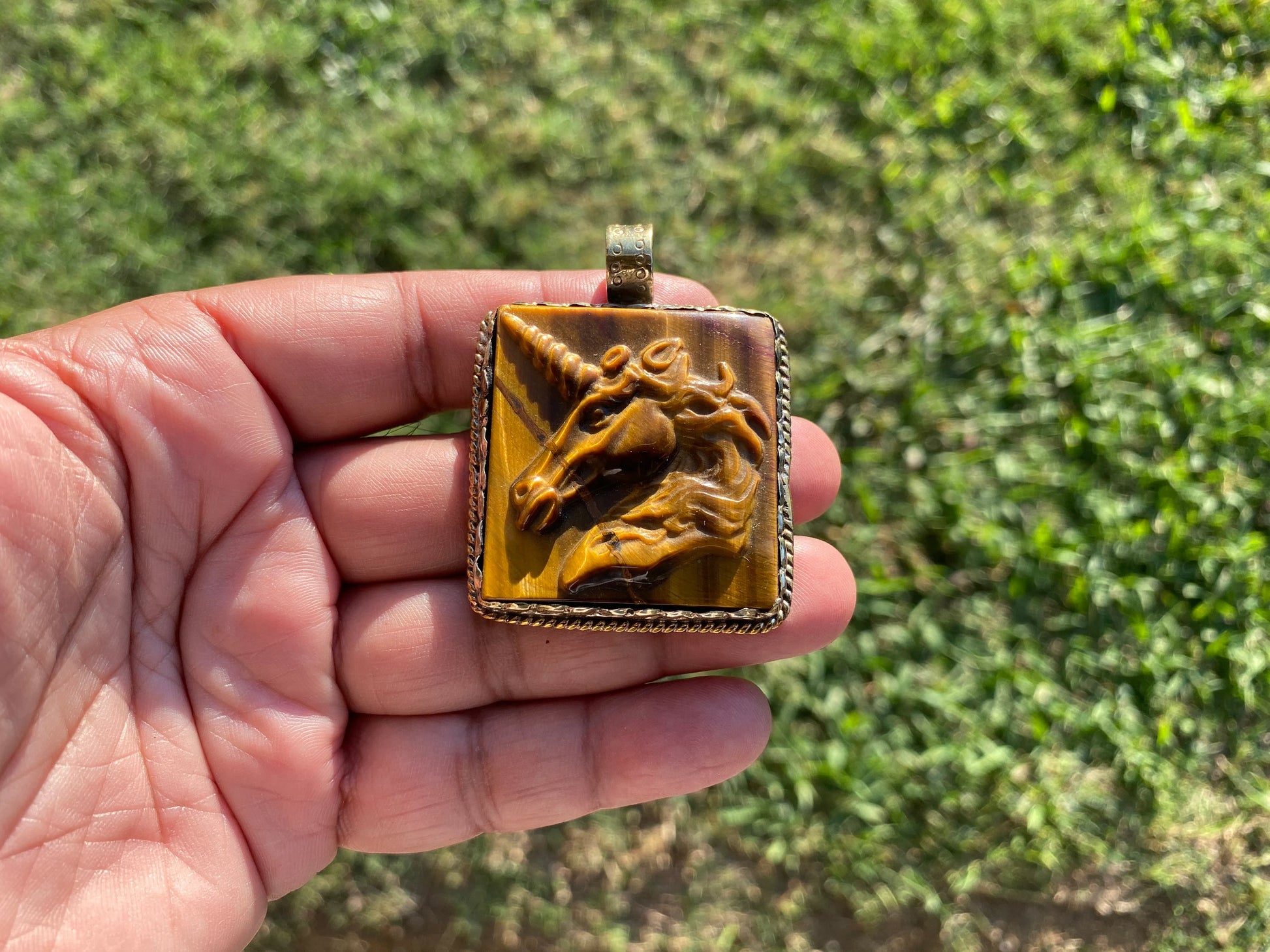 Made with Tibetan Silver & Tiger Eye Natural Stone Carved Unicorn Designs Pendant. Beautiful hand carved flower on the back. These are sure to make an impact on your jewelry project. This pendant would be a great addition to your necklace, would look great strung on beaded Necklace, Chain or Mala.Beauty and magic of this pendant that is unmatched as they are handmade and are one of a kind. With the nature of them being handmade, each product is unique in its own right and no two products are the exact same. Large BailMeasurement: approximately Length 58 mm (measuring from bail to bottom), width 43 mm from the widest side, bail size: 10 mm and weight about 34.30 gm.DD: 0350Disclaimer: Items are handmade so please note: Each item is unique may have some small imperfections. There can be a slight difference in actual color than shown in picture.Images may appear enlarged or smaller. Please refer to the measurements given. ✤ Keep in mind:1. Product VarianceAs the jewelry is handmade in nature, the items may experience variance in texture, shape, color, and finish. This also comes with some imperfections, which sets them apart from jewelry made in a factory – that being said please read the description thoroughly and view the pictures before you make your final purchase. As always, please don’t hesitate to ask us if you have any questions as we are more than happy to provide you with utmost quality assurance.