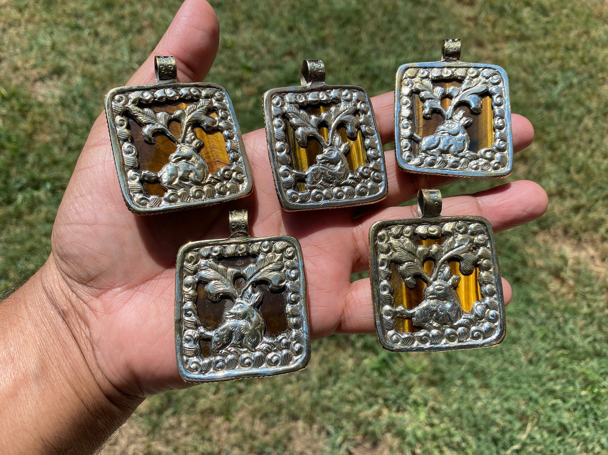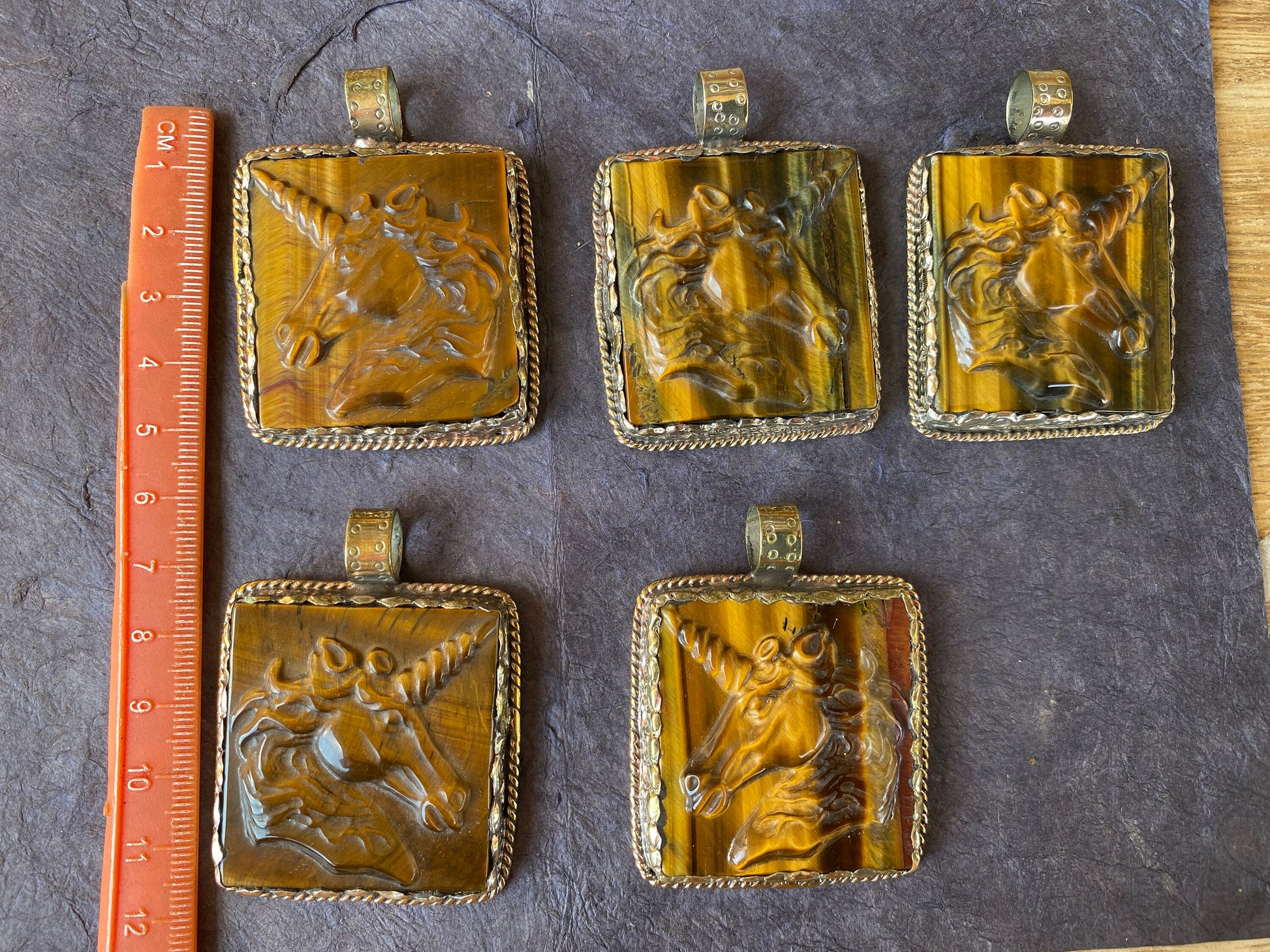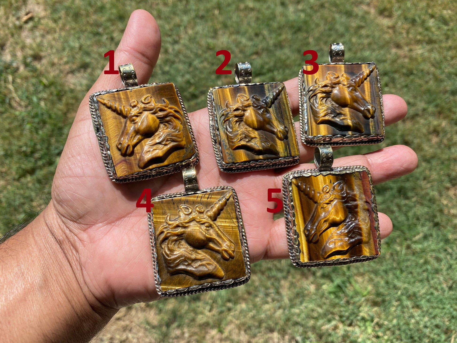 Made with Tibetan Silver & Tiger Eye Natural Stone Carved Unicorn Designs Pendant. Beautiful hand carved flower on the back. These are sure to make an impact on your jewelry project. This pendant would be a great addition to your necklace, would look great strung on beaded Necklace, Chain or Mala.Beauty and magic of this pendant that is unmatched as they are handmade and are one of a kind. With the nature of them being handmade, each product is unique in its own right and no two products are the exact same. Large BailMeasurement: approximately Length 58 mm (measuring from bail to bottom), width 45 mm from the widest side, bail size: 10 mm and weighs about 33.50 gm.DD: 0350Disclaimer: Items are handmade so please note: Each item is unique may have some small imperfections. There can be a slight difference in actual color than shown in picture.Images may appear enlarged or smaller. Please refer to the measurements given. ✤ Keep in mind:1. Product VarianceAs the jewelry is handmade in nature, the items may experience variance in texture, shape, color, and finish. This also comes with some imperfections, which sets them apart from jewelry made in a factory – that being said please read the description thoroughly and view the pictures before you make your final purchase. As always, please don’t hesitate to ask us if you have any questions as we are more than happy to provide you with utmost quality assurance.