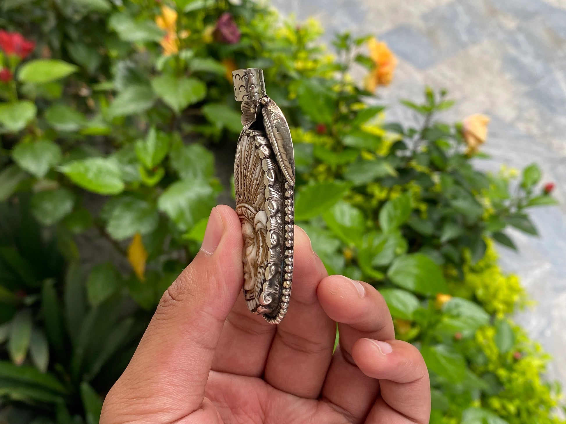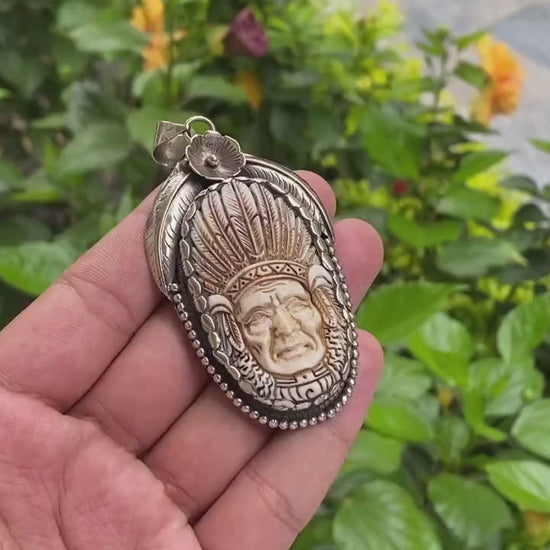 This large Indian chief pendant showcases an intricately carved Indian chief face in buffalo bone, framed by antique charm. Perfect for daily wear, this unique piece complements boho fashion with its unisex appeal. The hammered finish adds a rustic touch, while the handmade craftsmanship ensures each pendant is one-of-a-kind, blending cultural artistry with modern style.