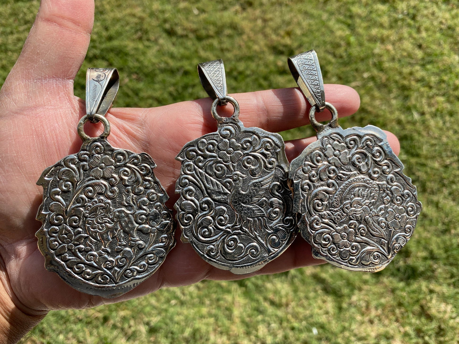 This one of a kind Tibetan Pendant made with Tibetan Silver (Repousse Silver) & Labradorite Natural Stone with faceted Aquamarine Gemstone pendant. Beautiful hand carved designs on the back. These are sure to make an impact on your jewelry project. This pendant would be a great addition to your necklace, would look great strung on beaded Necklace, Chain or Mala. This Ethnic designs pendant is handmade in Nepal. Perfectly bohemian in style, these tribal beauties come from the Himalayas.Beauty and magic of this pendant that is unmatched as they are handmade and are one of a kind. With the nature of them being handmade, each product is unique in its own right and no two products are the exact same.