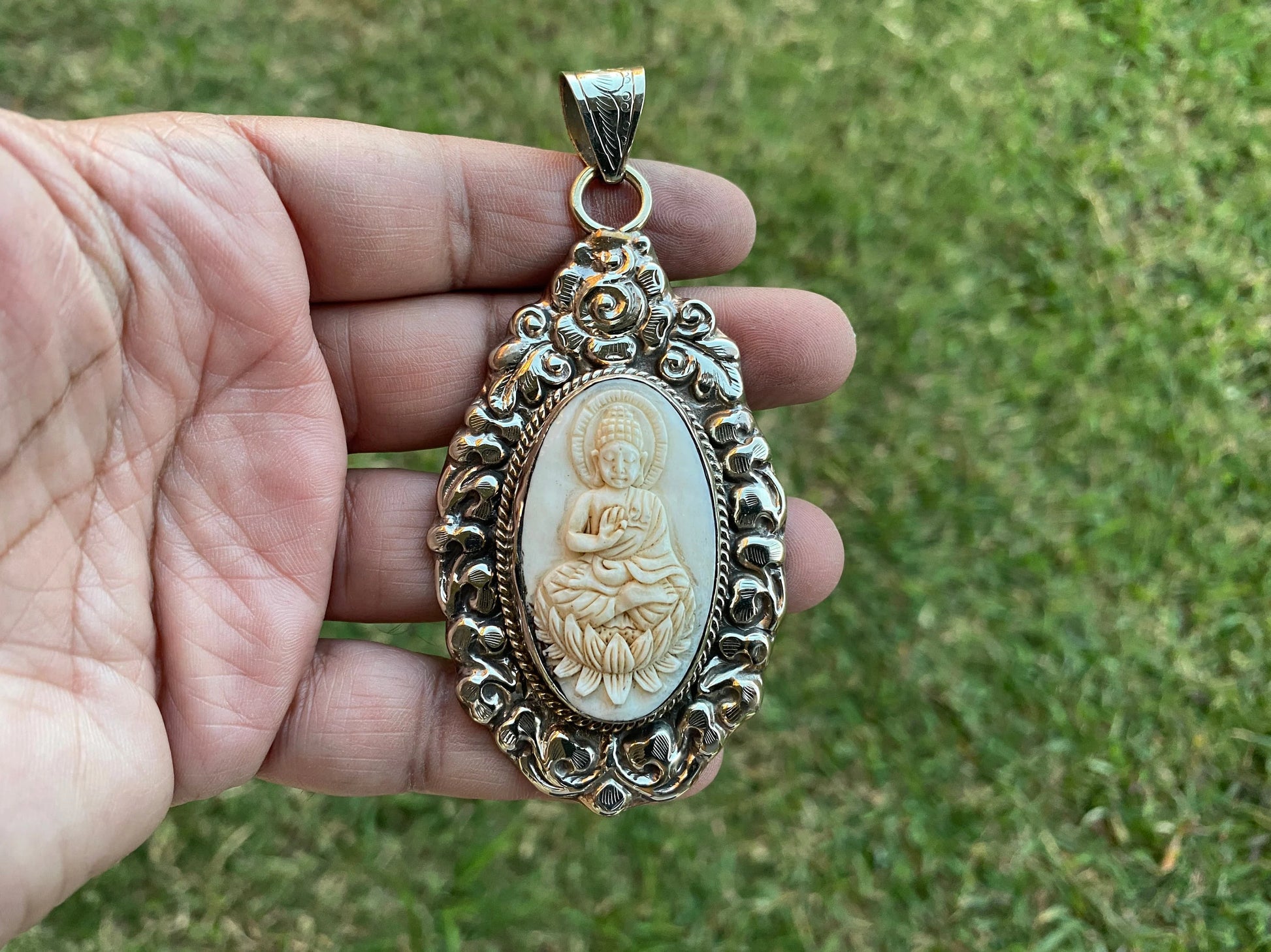 Large Meditating Buddha Tibetan Silver Pendant, Buffalo Bone Healing Yoga Jewelry, Tranquility Pendant, Unisex Pendant, Spiritual Amulets