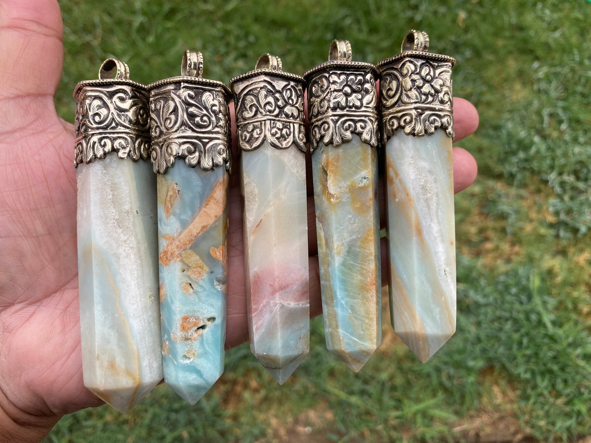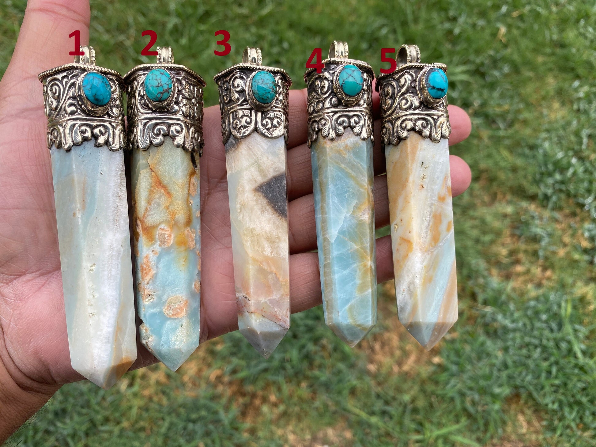 Large Pointed Amazonite with Natural Turquoise Tibetan Silver Pendant, Unique Design, Healing Crystal, Balancing Gem, Unique Jewelry