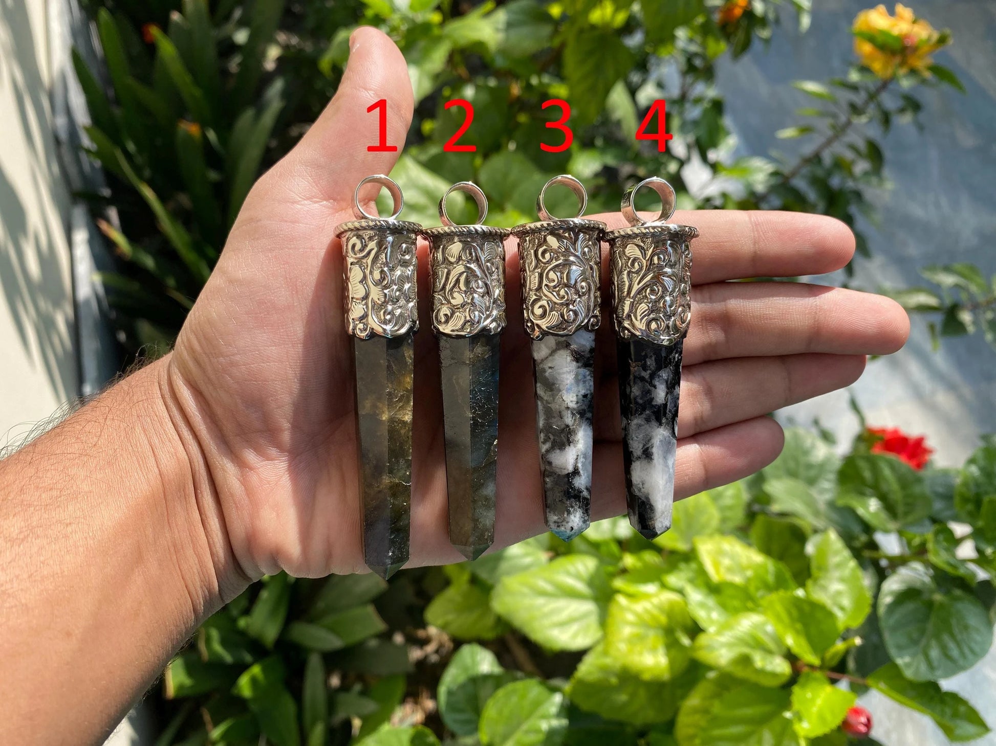 Large Pointed Natural Gemstone Tibetan Silver Pendant | Labradorite / Moonstone Natural Stone, Handmade Bohemian Jewelry, Hippie Pendant