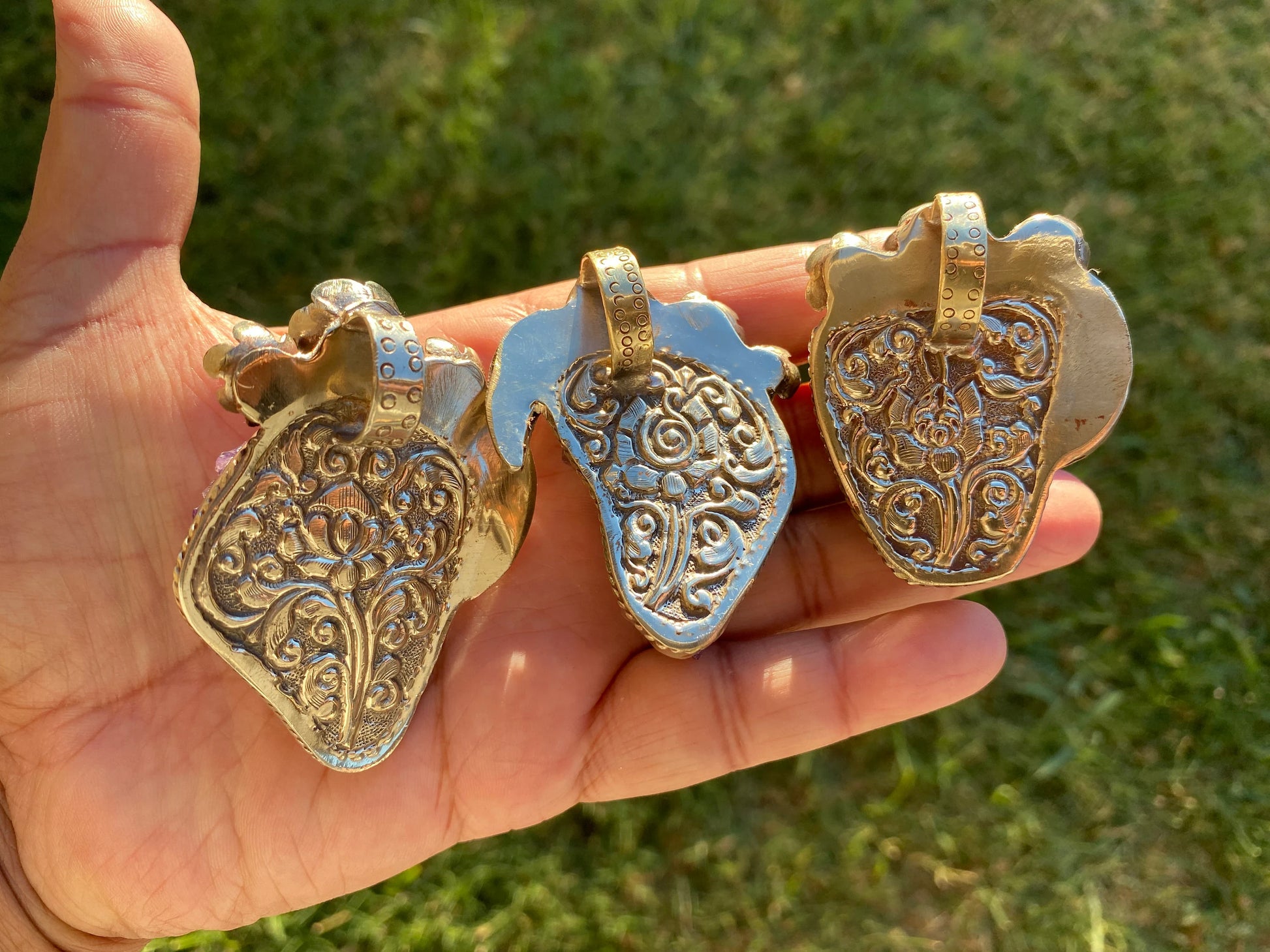 Measurement:Left Pendant: approximately Length 68 mm (measuring from bail to bottom), width 46 mm from the widest side, bail size: 10 mm and weight about 59.50 gm.Center Pendant: approximately Length 63 mm (measuring from bail to bottom), width 42 mm from the widest side, bail size: 10 mm and weight about 44.70 gm.Right Pendant: approximately Length 54 mm (measuring from bail to bottom), width 41 mm from the widest side, bail size: 10 mm and weight about 56.20 gm.