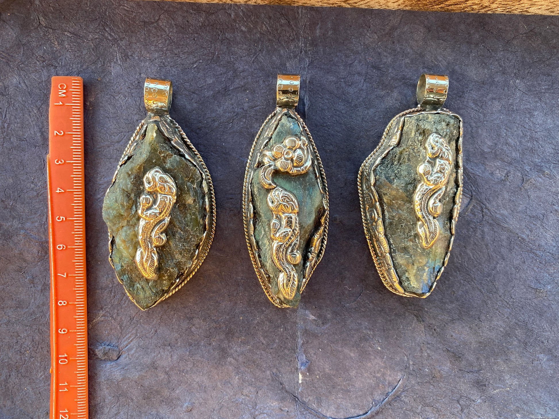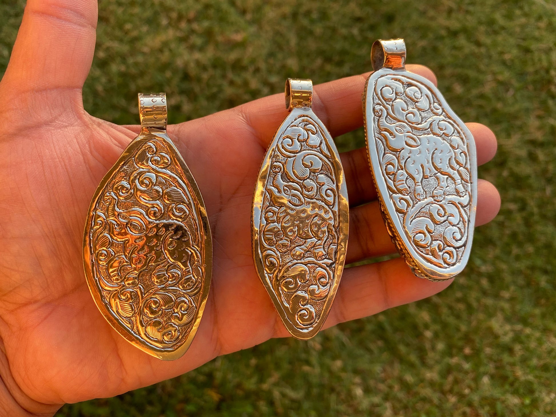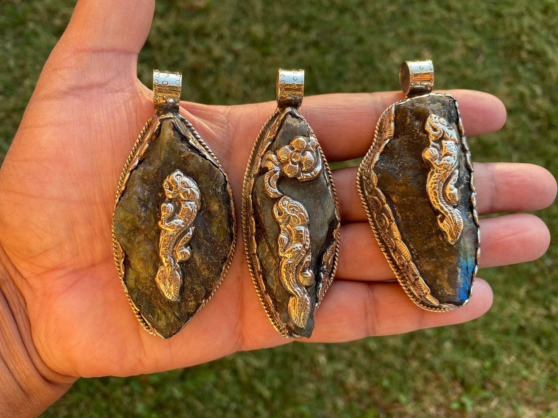 Measurement: Left Pendant: approximately Length 80 mm (measuring from bail to bottom), width 35 mm from the widest side, bail size: 10 mm and weighs about 55.80 gm.Center Pendant: approximately Length 83 mm (measuring from bail to bottom), width 30 mm from the widest side, bail size: 10 mm and weighs about 54.20 gm.Right Pendant: approximately Length 80 mm (measuring from bail to bottom), width 37 mm from the widest side, bail size: 10 mm and weighs about 54.40 gm.DD: 0350Disclaimer: Items are handmade so please note: Each item is unique may have some small imperfections. There can be a slight difference in actual color than shown in picture.Images may appear enlarged or smaller. Please refer to the measurements given.