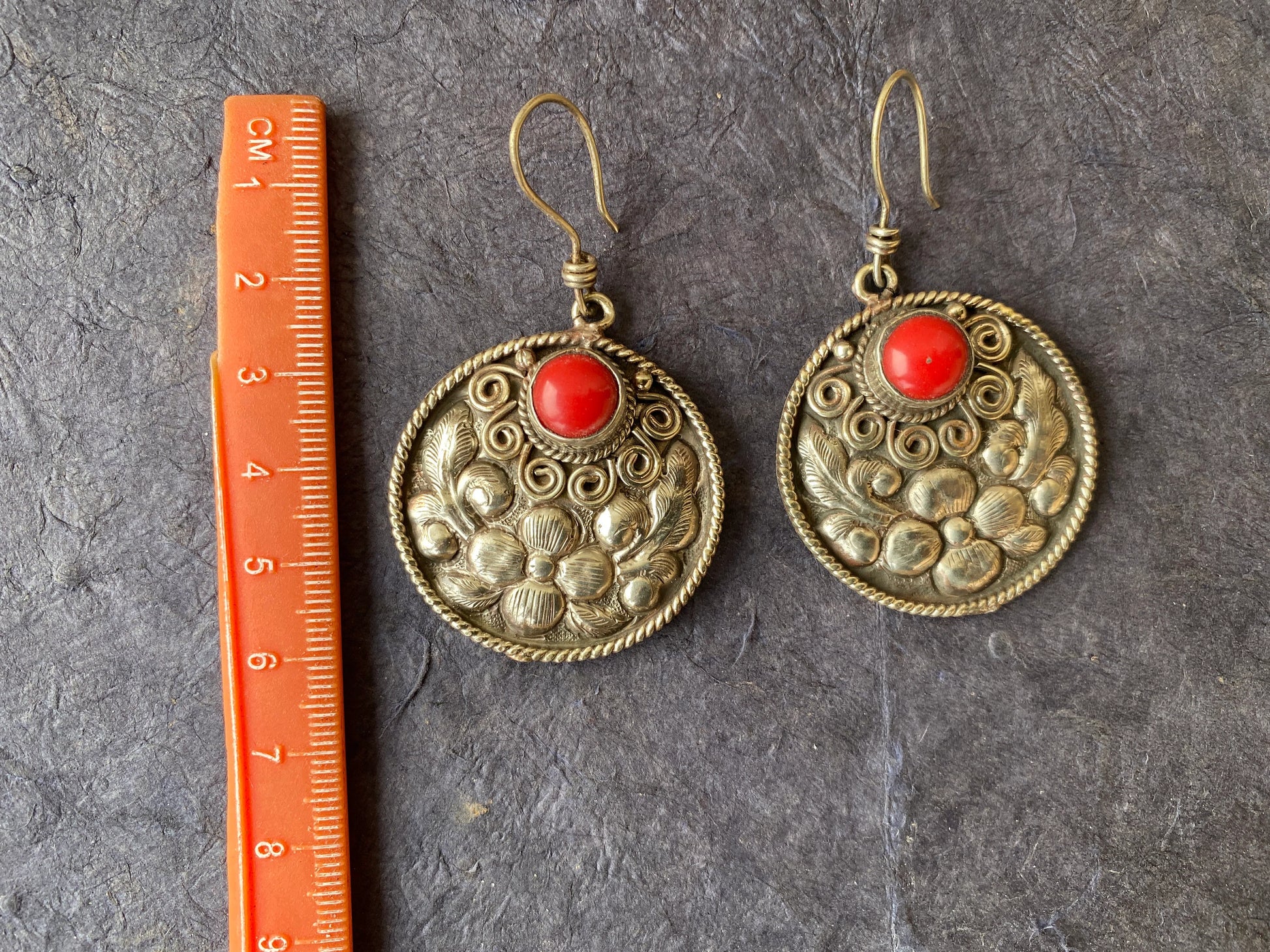 This listing is for 1 pair.At wholesale price!!! These Tibetan Silver dangle earrings made with Red Coral Gemstone were handcrafted in Nepal. Measurement approximately 60 mm long including the hook, 37 mm wide (measuring the widest part of the dangle), and weight about 16.40 gm....
