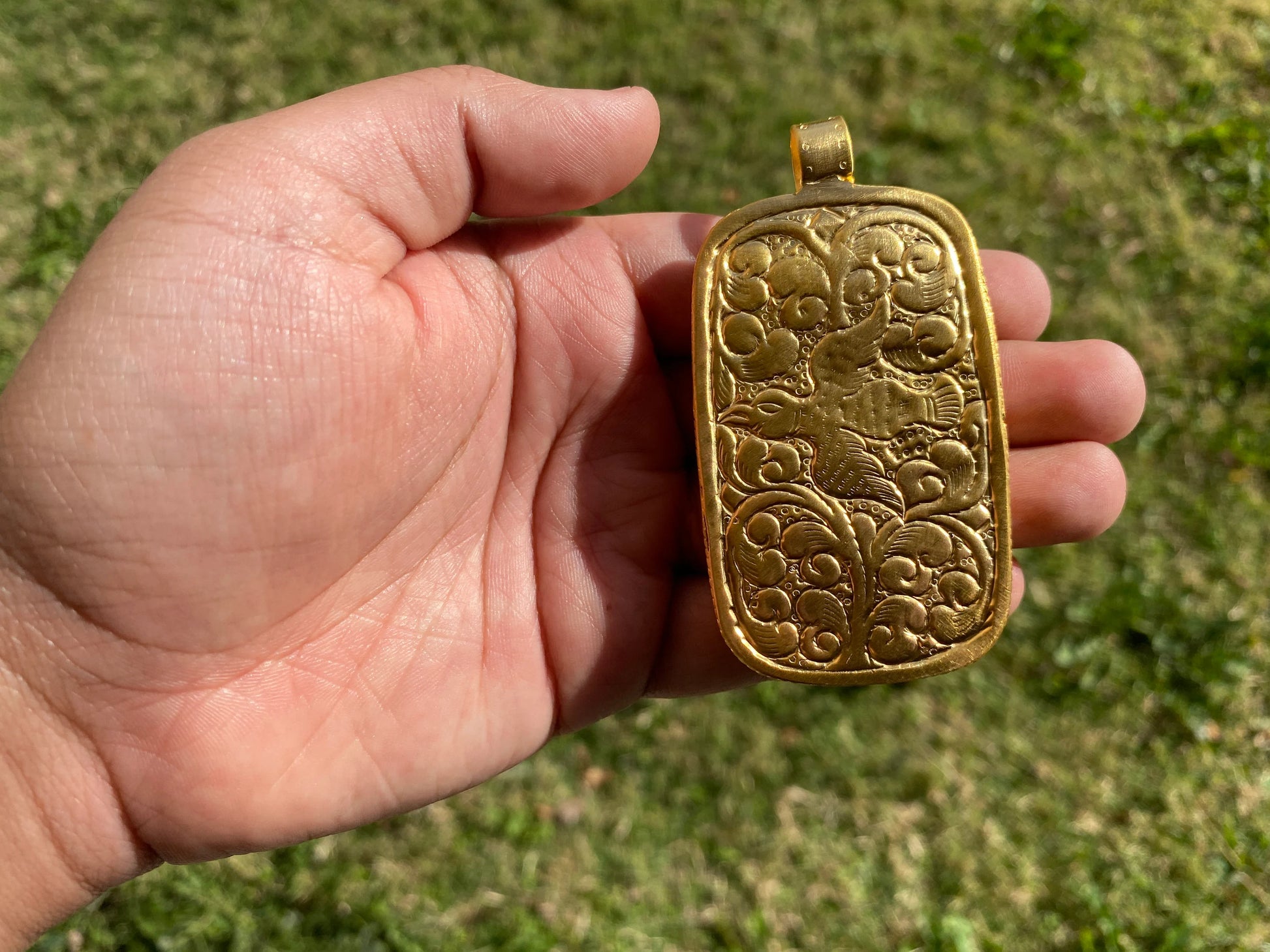This Gorgeous Buffalo Bone Pendant, 18K Matte Gold Overlay over Brass with anti tarnish finish with a remarkable detail of carving. Hand-carved Floral & Bird design on the back side of Pendant. This Tibetan designs pendant is handmade in Nepal and adorned by a beautiful pendant. Perfectly bohemian in style, these tribal beauties come from the Himalayas. Beauty of this pendant that is unmatched as they are handmade and are one of a kind. With the nature of them being handmade, each product is unique in its own right and no two products are the exact same.