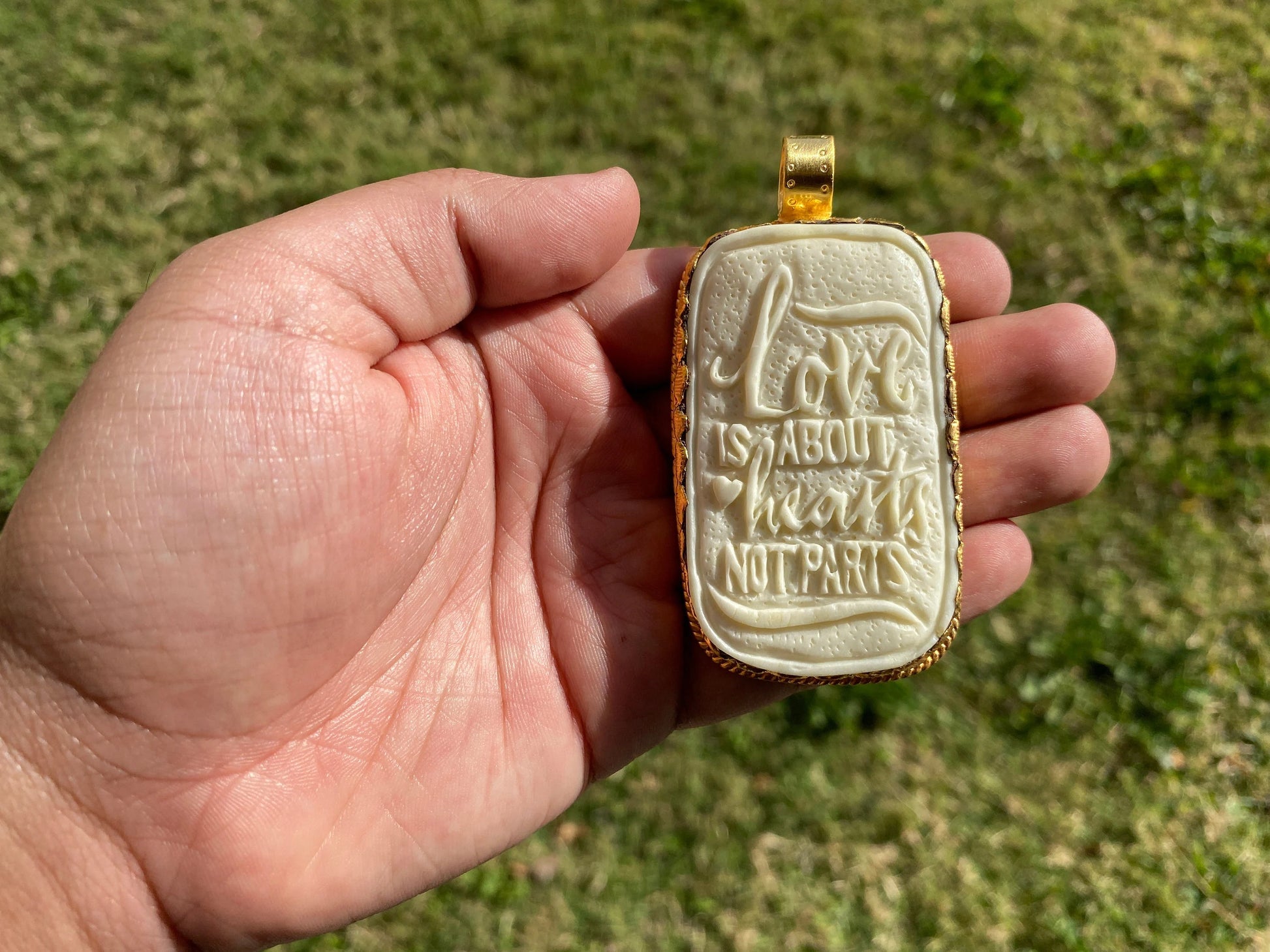 LGBTQ Pendant, Love Is About Hearts Not Parts, Carved Bone 18K Brushed Gold Overlay Pendant, Gay & Lesbian Pride, Great Gift for Proud Gay