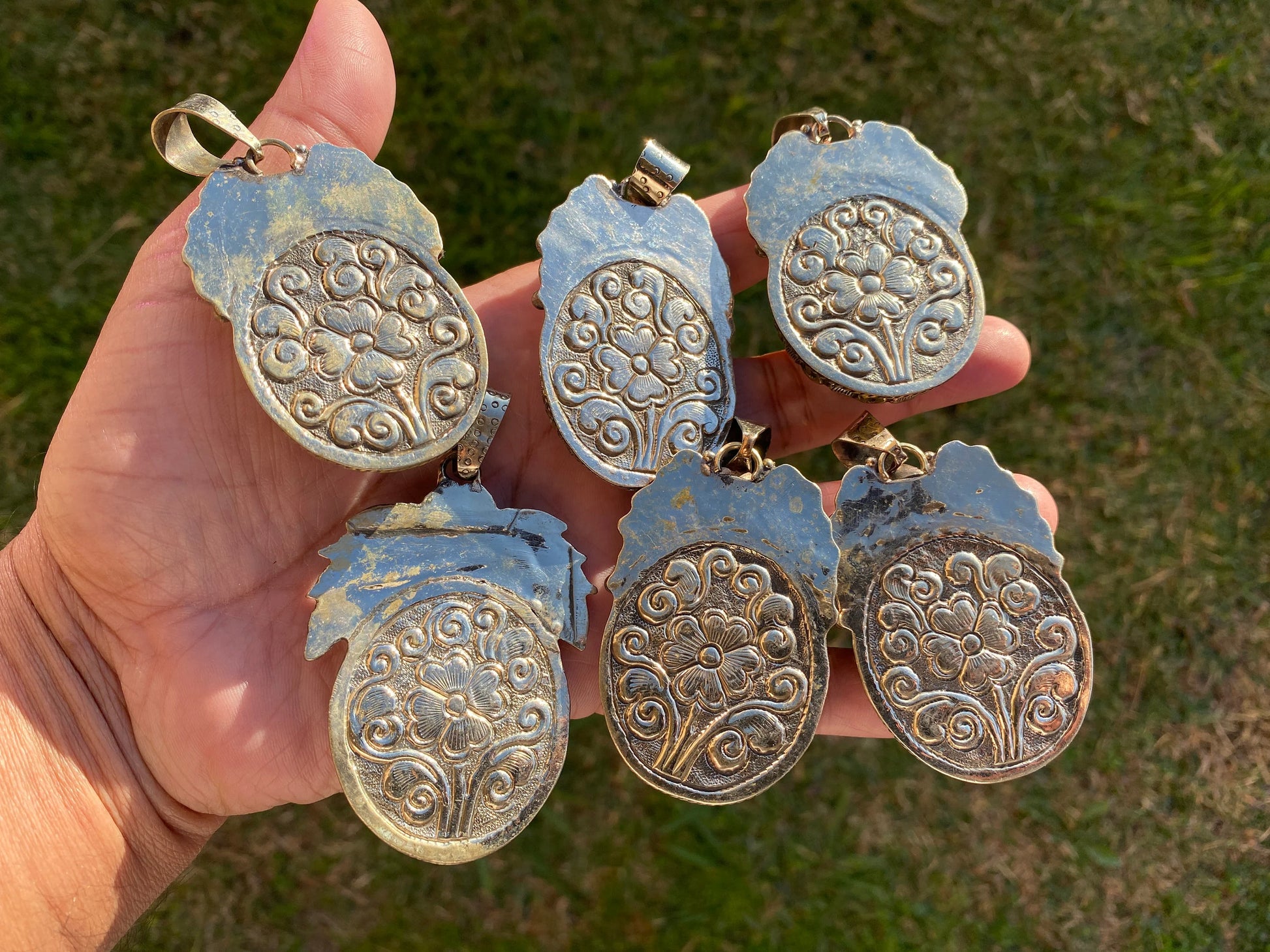 Made with Tibetan Silver with Natural Carved Tiger Eye stone. Beautiful hand carved flower on the back of the pendant. These are sure to make an impact on your jewelry project. This pendant would be a great addition to your necklace, would look great strung on beaded Necklace, Chain or Mala.Beauty and magic of this pendant that is unmatched as they are handmade and are one of a kind. With the nature of them being handmade, each product is unique in its own right and no two products are the exact same. Large Bail