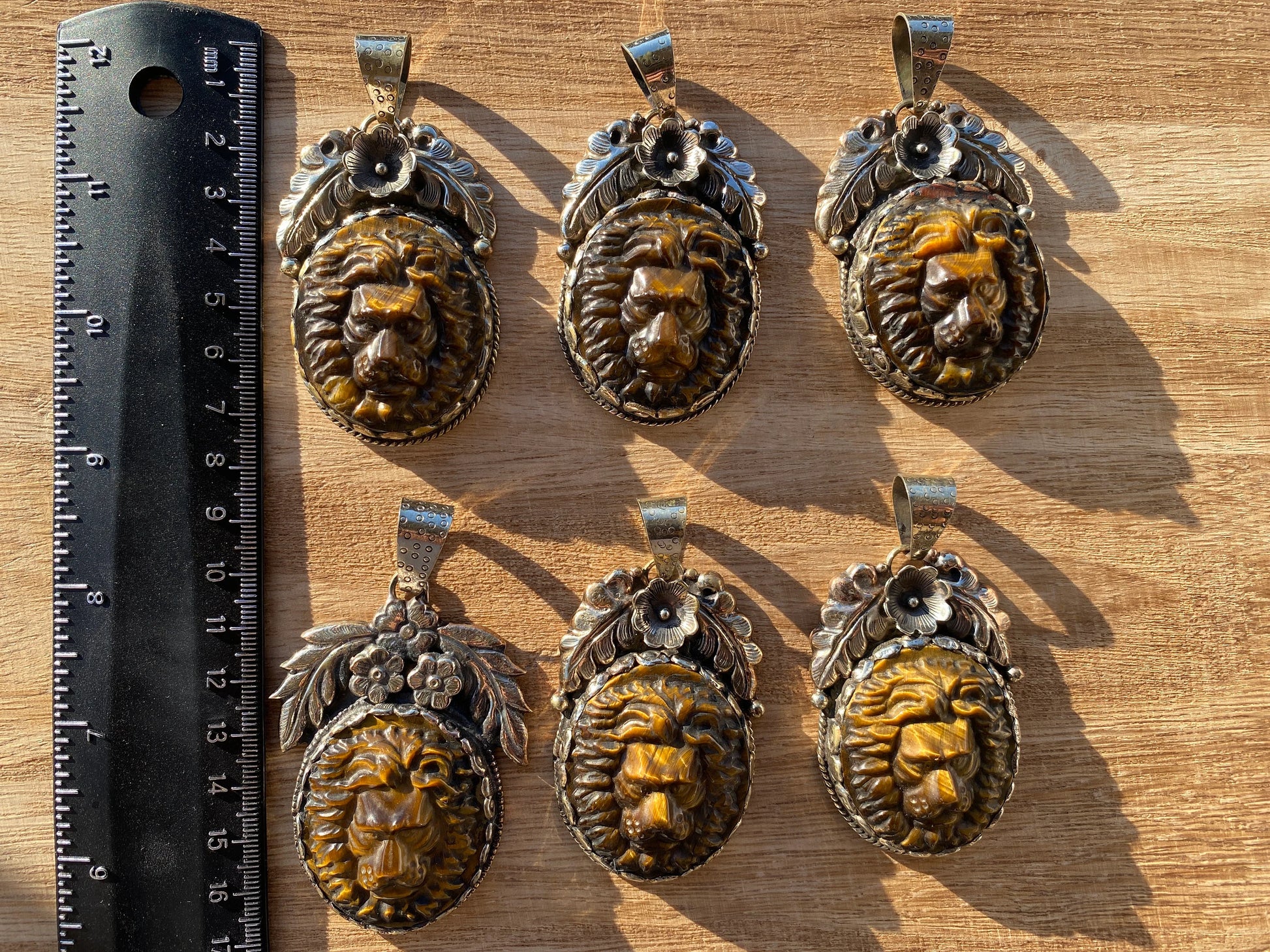 Lion Head Tiger Eye Natural Stone Tibetan Silver Pendant, Hand Carved Lion Pendant, Animal Lover's Jewelry, Crystal Pendant, Animal Pendant