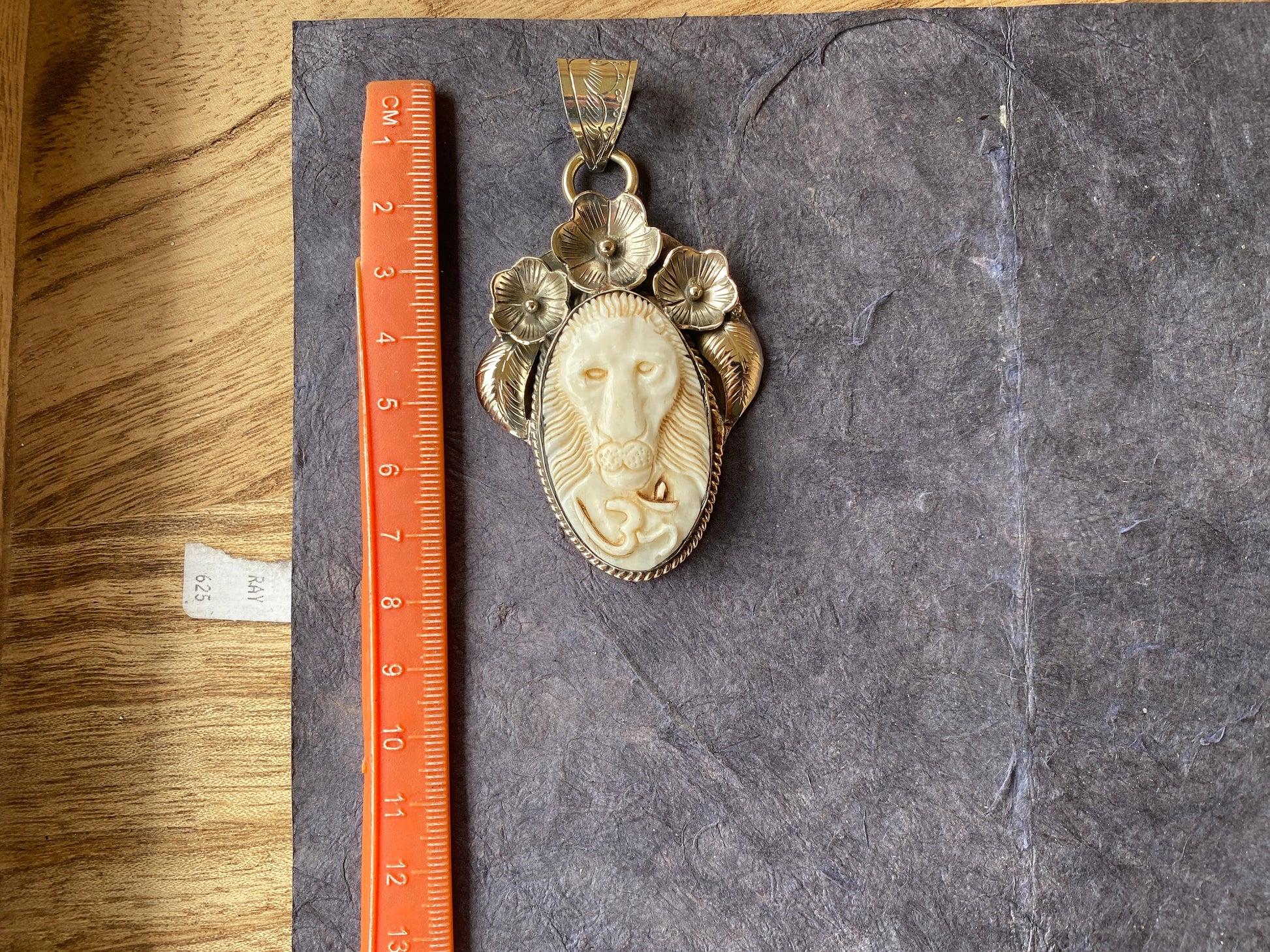 Water Buffalo Bone carved Lion Head with Om Pendant, Made with Tibetan Silver, Himalayan, Tribal, Ethnic, Animal Pendant,