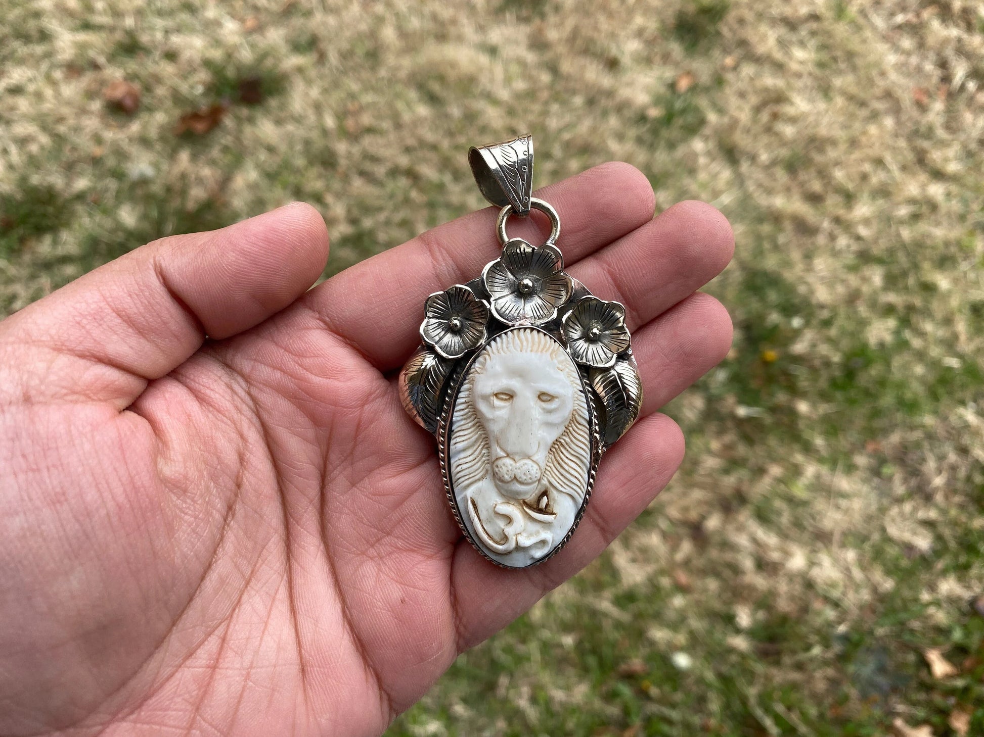 Lion with Om Bone Carved Tibetan Silver Pendant, Wildlife Jewelry, Sacred Spiritual Symbol, Sound of The Universe, Animal Lover's Jewelry