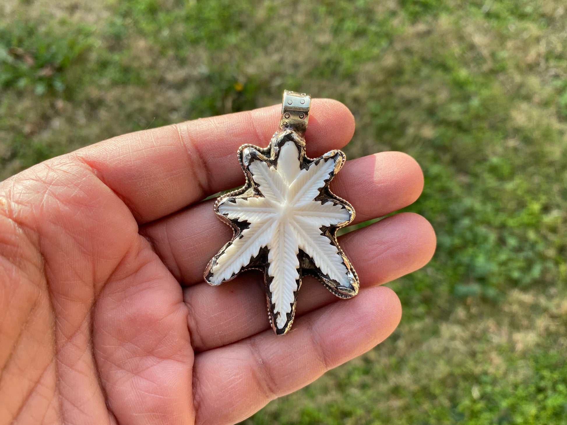 This listing is for 1 piece.At wholesale price!!! This Gorgeous Marijuana Leaf Buffalo Bone pendant made with Tibetan Silver ( Repousse Silver ) with a remarkable detail of carving. Hand-carved design on the back side of Pendant. This Tibetan designs pendant is handmade in Nepal...