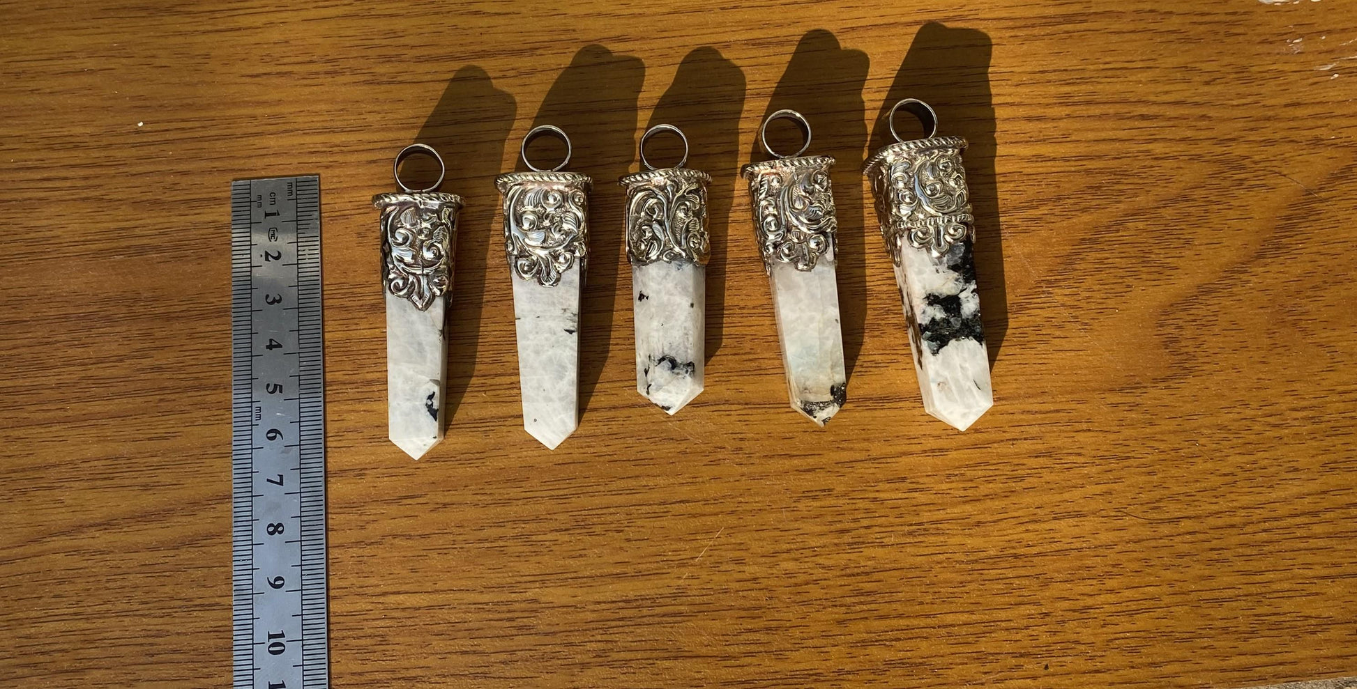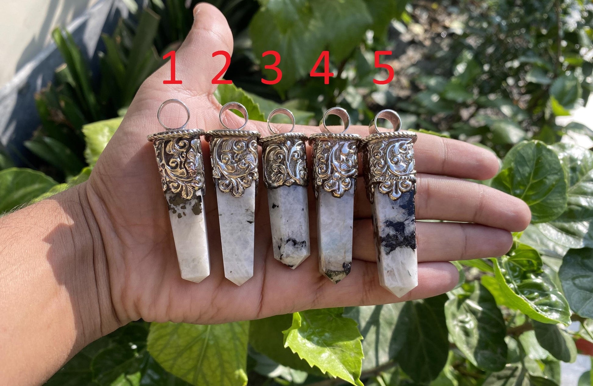 DA0350This listing is for 1 piece.Measurement: approximately Length 75mm (measuring from bail to bottom), width 23mm from the widest side, bail size: 10mm and weight about 41.00 gm. This handmade Moonstone pendant in Tibetan silver, brings positive energy and healing properties with it, perfect for...
