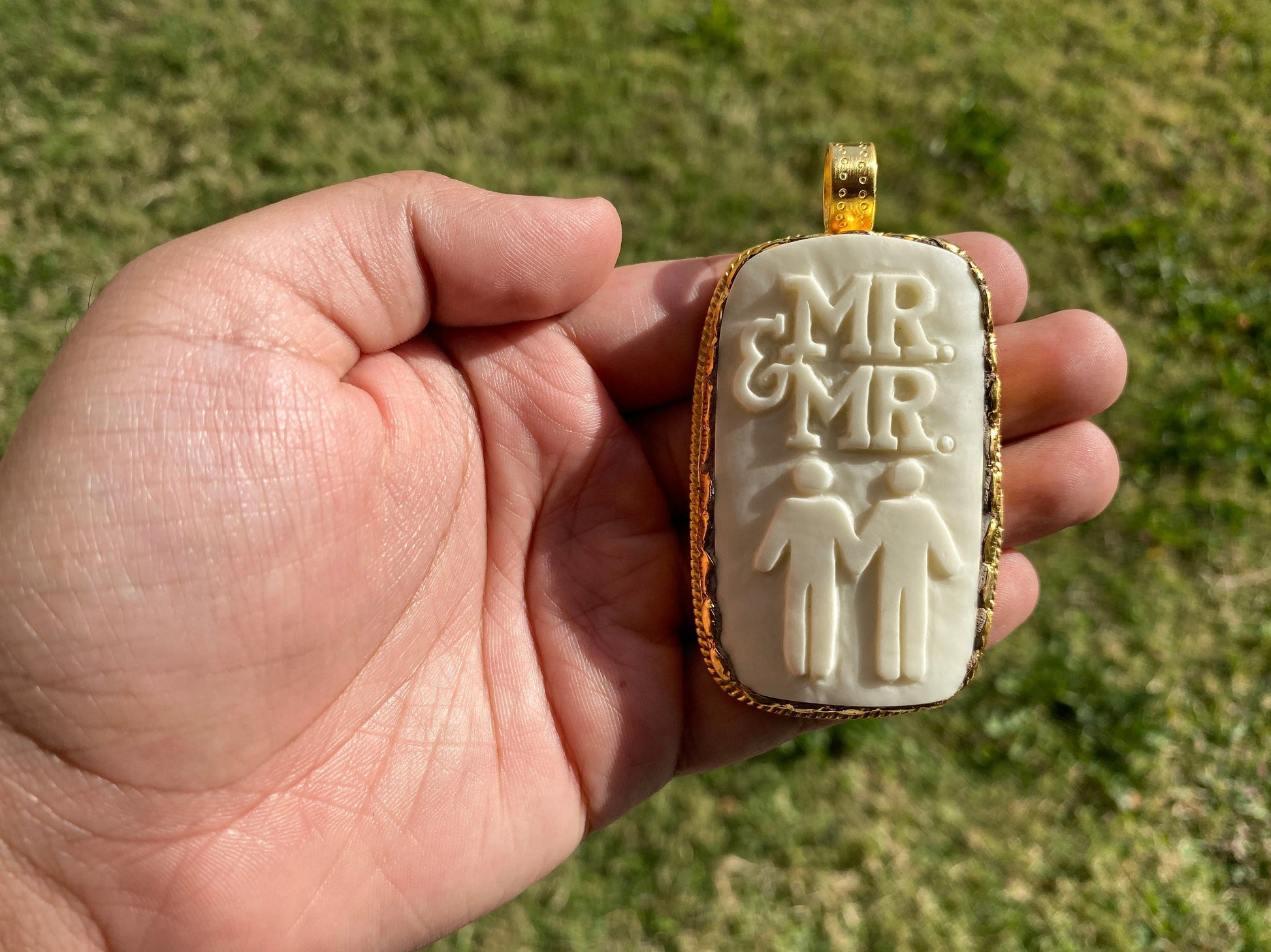 Mr and Mr Gay Wedding Bone Carved 18K Brushed Gold Overlay Pendant, LGBT Wedding Gift, Same Sex Marriage, Gay Wedding Gift, Gay Pride Gift
