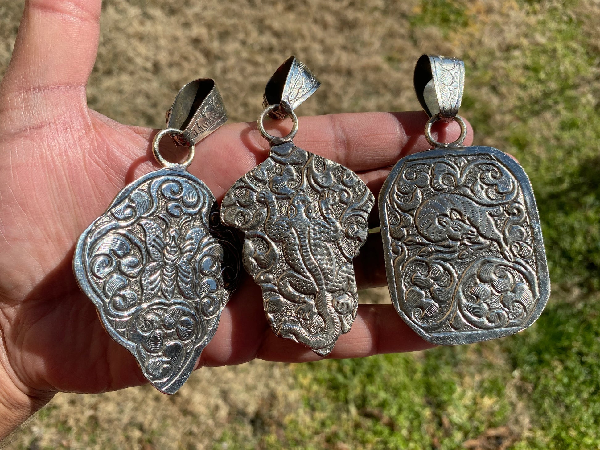 Measurement: Left Pendant: approximately Length 105 mm (measuring from bail to bottom), width 50 mm from the widest side, bail size: 12 mm and weighs about 47.10 gm.Center Pendant: approximately Length 103 mm (measuring from bail to bottom), width 48 mm from the widest side, bail size: 12 mm and weighs about 44.60 gm.Right Pendant: approximately Length 95 mm (measuring from bail to bottom), width 48 mm from the widest side, bail size: 12 mm and weighs about 53.90 gm.