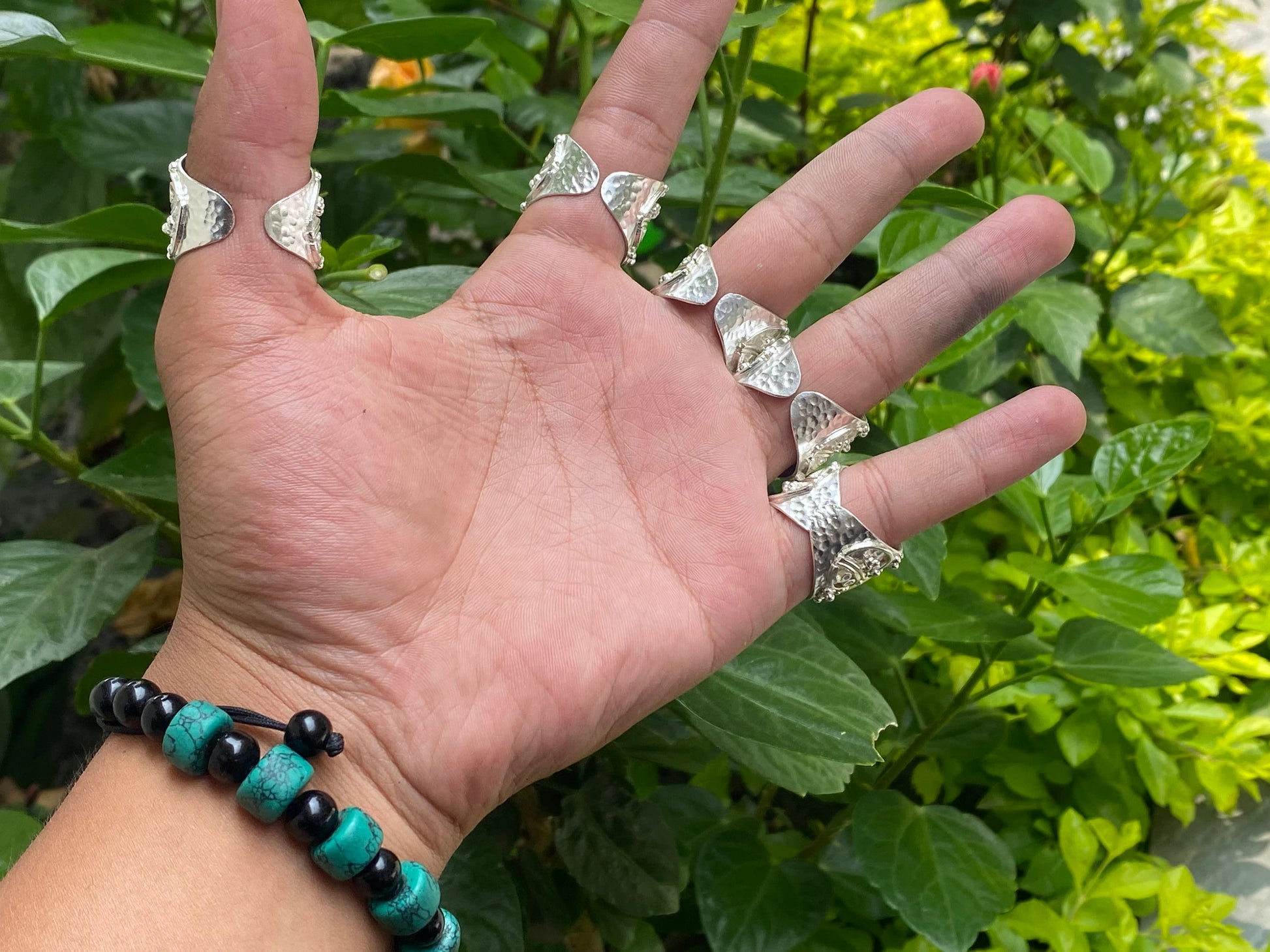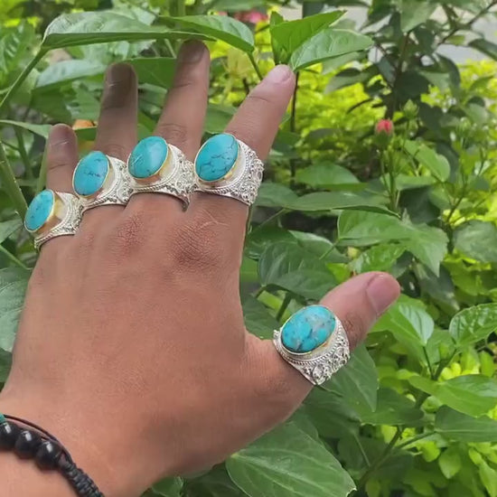 This adjustable two-tone ring features natural turquoise adorned with brushed gold and silver overlay on brass, embodying a boho aesthetic. Handmade with a hammered finish, it blends rustic charm with healing properties often associated with turquoise. Perfect as a unisex gift, its unique design appeals to those who appreciate eclectic, artisanal jewelry and hippie fashion sensibilities.