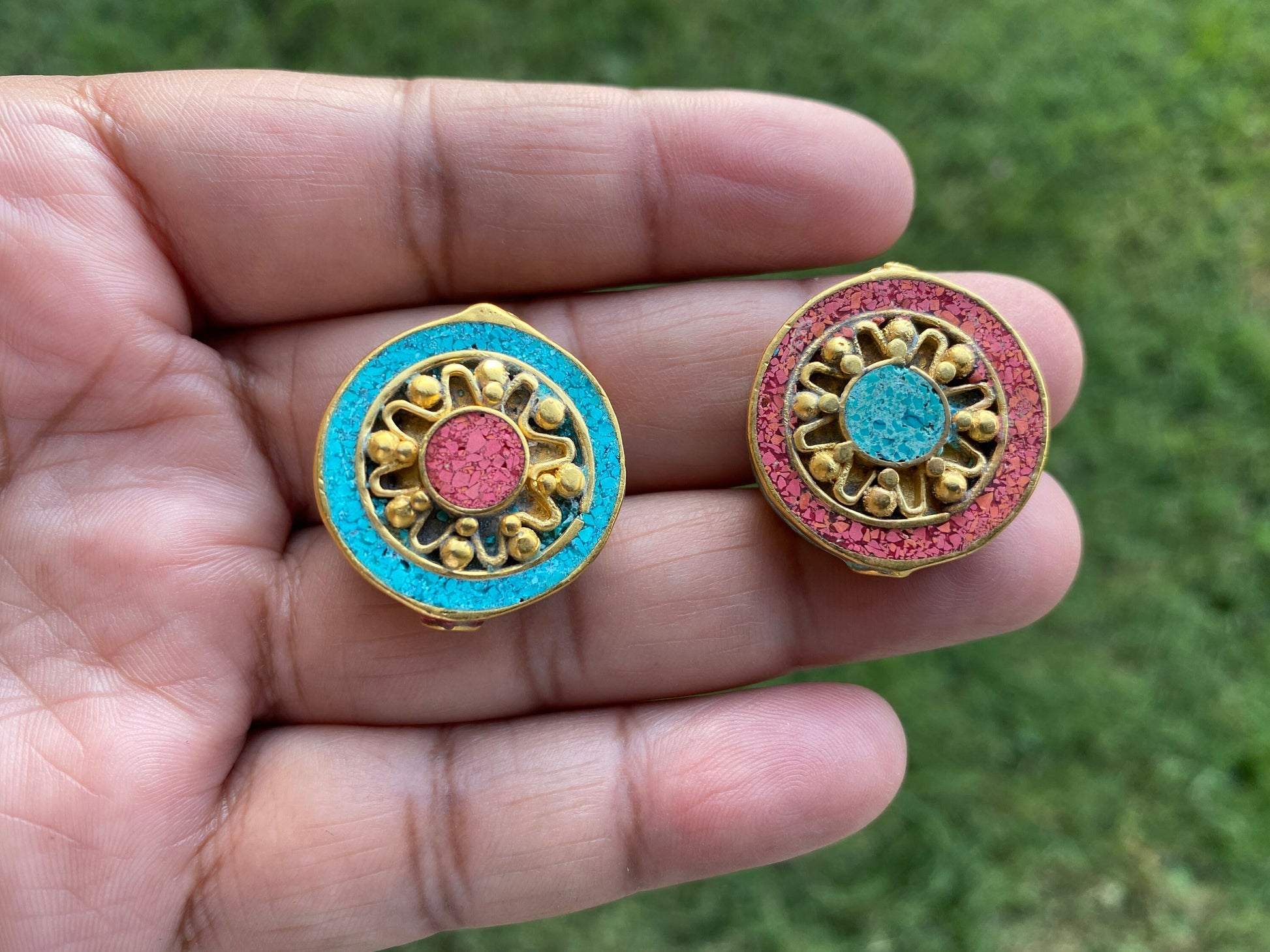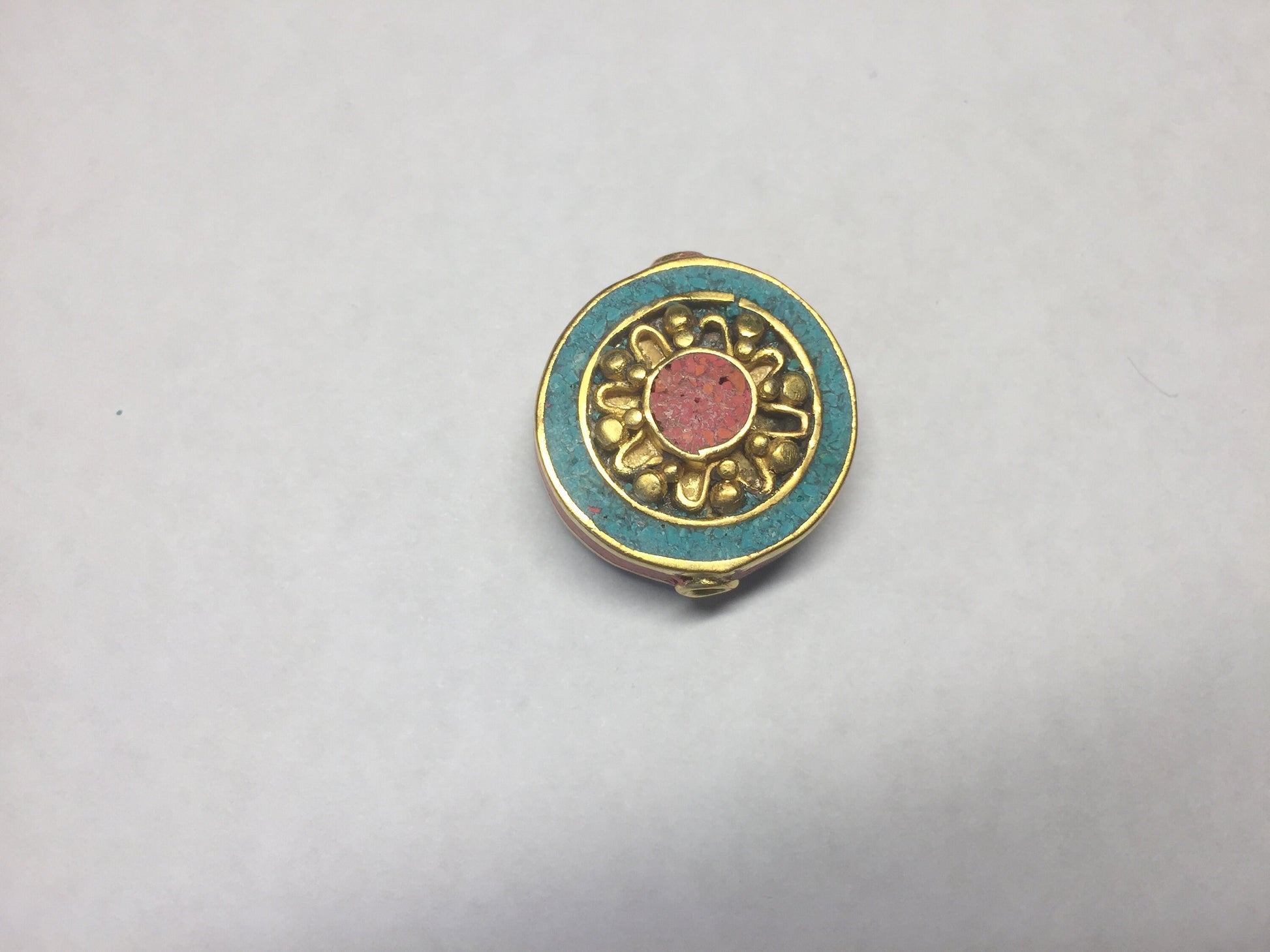 These beautiful high quality 18K Matte Gold Overlay over brass with anti-tarnish finish so that It will not tarnish. These Tibetan beads were handcrafted in Nepal. Hand-carved beads made with Turquoise with Coral inlaid, both-side same designs. These Beads are sure to make an impact on your jewelry project. These beads would be a great addition to your necklace or bracelet project. These beads would look great strung on beaded necklace or Mala.
