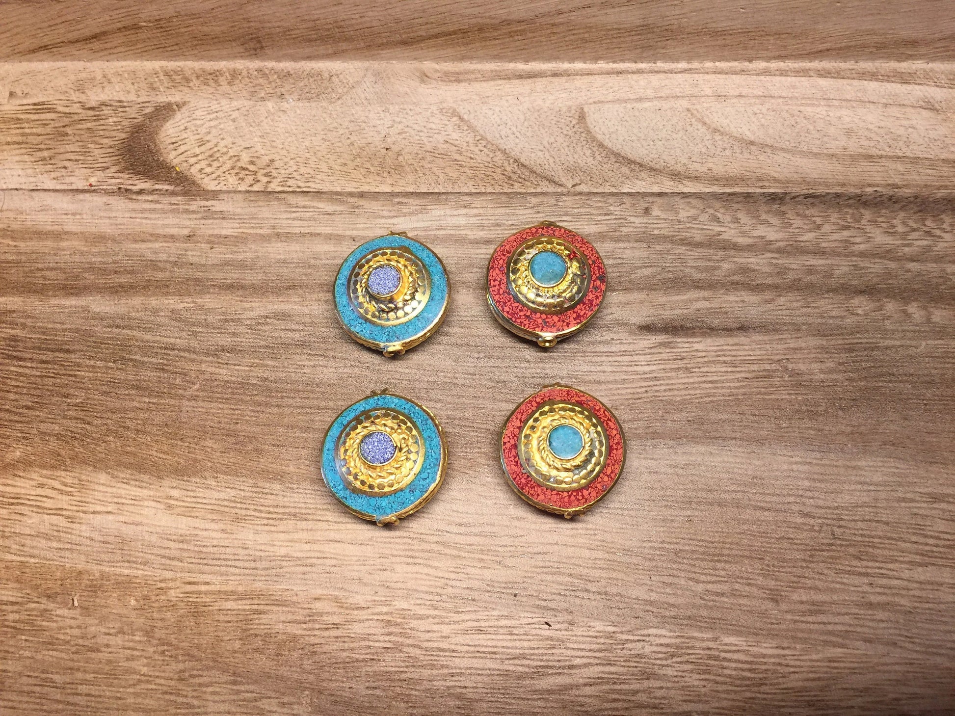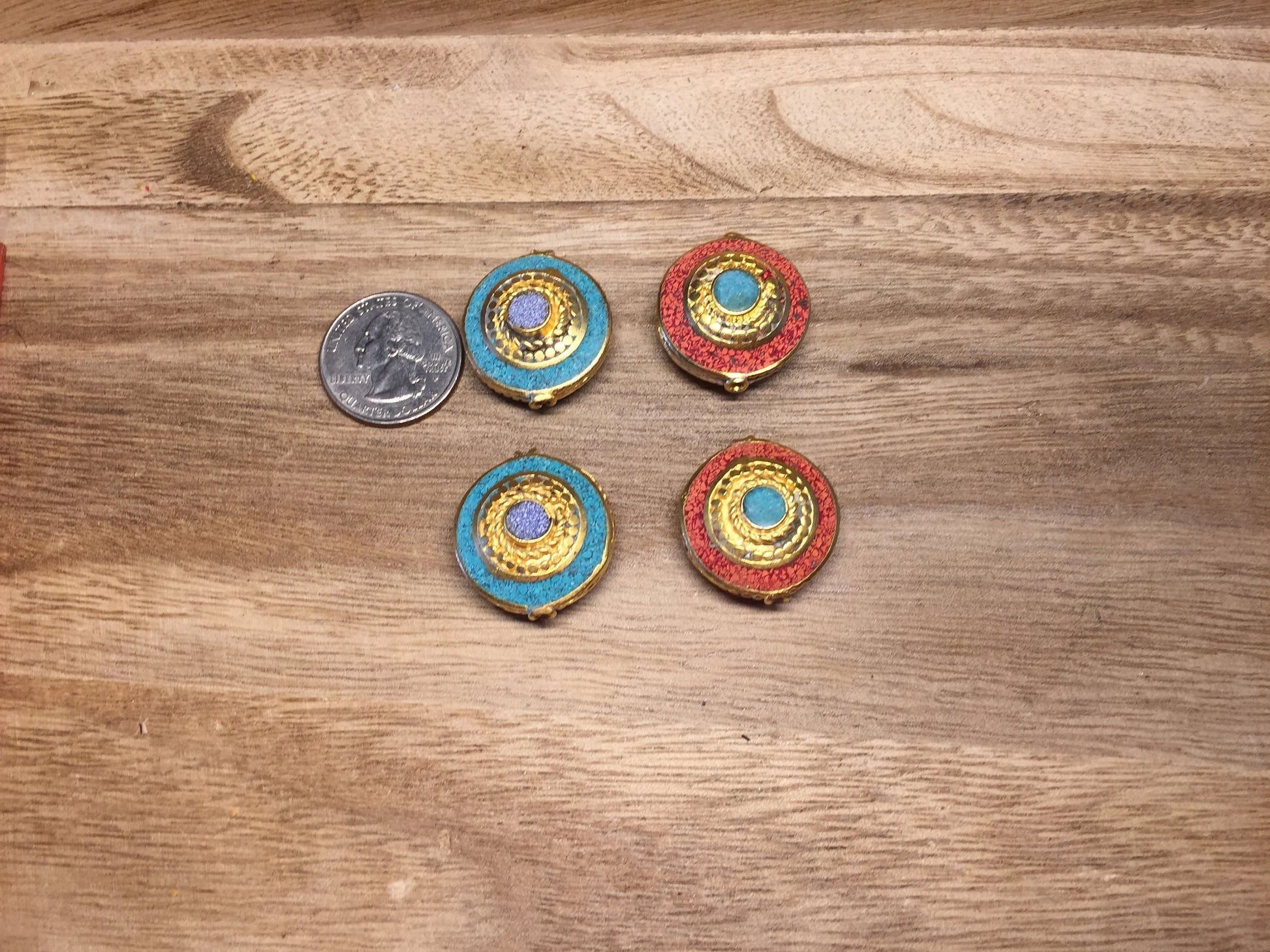 This listing is for 1 piece.At wholesale price!!!Measurement: approximately Length 24 mm Coin Shape ( measuring from hole to hole ), hole size: 3 mm and weighs about 9 gm.These beautiful high quality 18K Matt Gold Overlay over brass with anti-tarnish finish so that It will not tarnish. These Tibetan beads were handcrafted in Nepal. Hand-carved beads made with Coral, Lapis Lazuli & Turquoise Inlaid. These Beads are sure to make an impact on your jewelry project. These beads would be a great addition to your necklace or bracelet project. These beads would look great strung on beaded necklace or Bracelet Charm. Please note: you will receive a random beadDisclaimer: Items are handmade so please note: Each item is unique may have some small imperfections. There can be a slight difference in actual color than shown in picture.Images may appear enlarged or smaller. Please refer to the measurements given. ✤ Keep in mind:1. Product VarianceAs the jewelry is handmade in nature, the items may experience variance in texture, shape, color, and finish. This also comes with some imperfections, which sets them apart from jewelry made in a factory – that being said please read the description thoroughly and view the pictures before you make your final purchase. As always, please don’t hesitate to ask us if you have any questions as we are more than happy to provide you with utmost quality assurance. 2. Photography & ColorsDue to the fact that we photograph each of our items, some items may seem larger than the actual size and the colors may seem off as well, please make sure to read the dimensions in order to avoid problems that can be easily taken care of. We do our best to photograph the items with as much detail as possible, however, images can deceive the eye, again – feel free to reach us with any questions or concerns!3. LiabilityDiscover Designs Inc. shall not be held responsible for any injuries, damages, or losses resulting from the use of products purchased from our shop. Therefore, by purchasing from our Etsy Store, you the costumer agree that all purchases and uses of products are responsibilities of the buyer. With that said, Discover Designs will not be held responsible for the use, misuse, or mishandling of any items and buyers assume all liabilities for the products they have purchased. The purchase of an item from Discover Designs demonstrates acceptance of this disclosure and releases Discover Designs and its affiliates from liabilities arising thereof. ✪Not a toy, not intended for use by, or in products intended for children 14 or under. May be harmful if swallowed.Thanks for stopping by!
