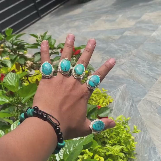 Enjoy the timeless beauty of this natural turquoise ring. Its oval-shaped turquoise centerpiece is elegant and adorned with delicate details. This adjustable, handmade piece has a hammered texture that adds a modern touch to its bohemian look. It's more than just a ring, crafted with care in Nepal—it's a sign of style, culture, and artisanal craftsmanship, ideal for the modern woman with a diverse taste.