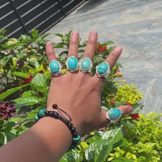 Our stunning turquoise ring captures the soul of Nepalese craftsmanship. Its appealing aesthetic, which combines antique beauty with modern flair, appeals to both men and women looking for one-of-a-kind adornments. This two-tone piece emanates hippie fashion vibes, expressing a combination of tradition and current style that is both timeless and trendy.