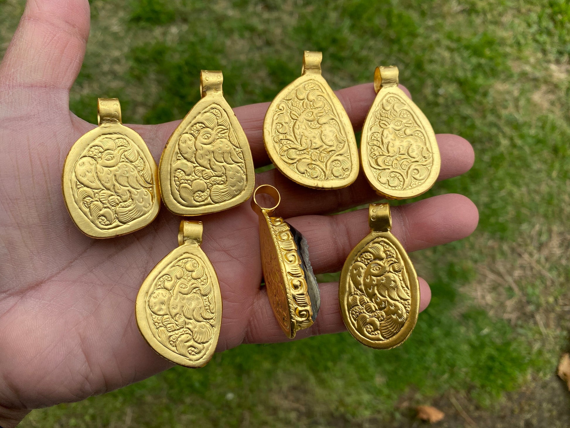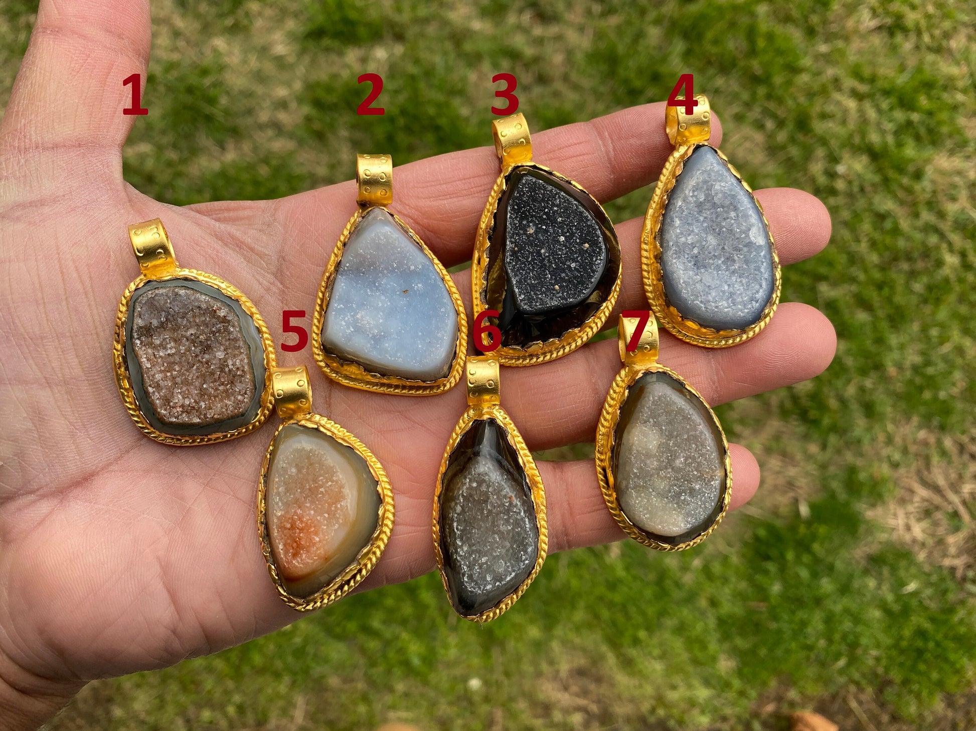 Measurement:# 1. Pendant: approximately Length 43 mm (measuring from bail to bottom), width 30 mm from the widest side, bail size: 9 mm and weight about 18.50 gm.# 2. Pendant: approximately Length 48 mm (measuring from bail to bottom), width 30 mm from the widest side, bail size: 9 mm and weight about 21.30 gm.# 3. Pendant: approximately Length 50 mm (measuring from bail to bottom), width 30 mm from the widest side, bail size: 9 mm and weight about 25.50 gm.# 4. Pendant: approximately Length 50 mm (measuring from bail to bottom), width 27 mm from the widest side, bail size: 9 mm and weight about 18.60 gm.# 5. Pendant: approximately Length 45 mm (measuring from bail to bottom), width 25 mm from the widest side, bail size: 9 mm and weight about 17.30 gm.# 6. Pendant: approximately Length 47 mm (measuring from bail to bottom), width 20 mm from the widest side, bail size: 9 mm and weight about 16.90 gm.# 7. Pendant: approximately Length 45 mm (measuring from bail to bottom), width 25 mm from the widest side, bail size: 9 mm and weight about 16.50 gm.