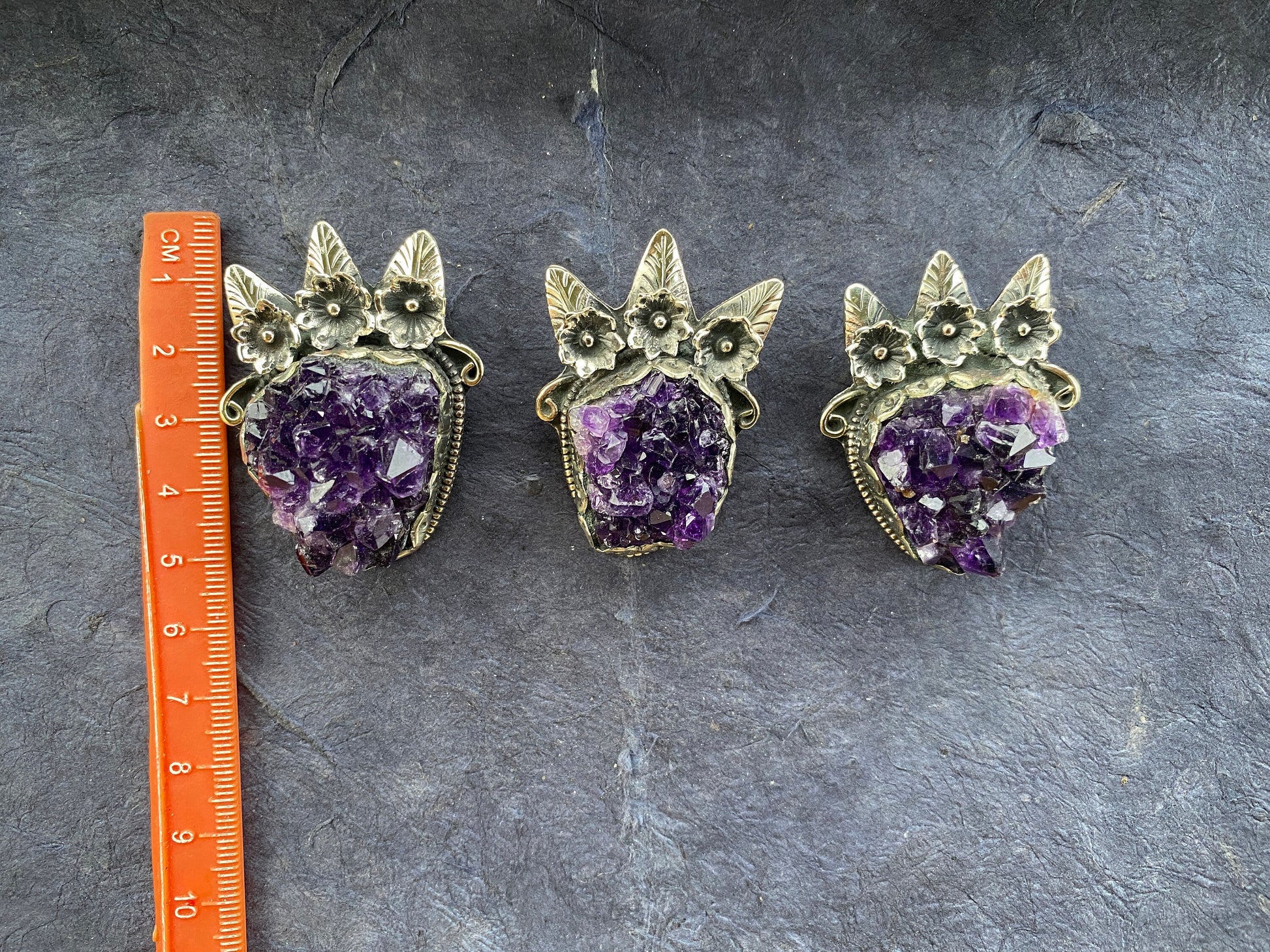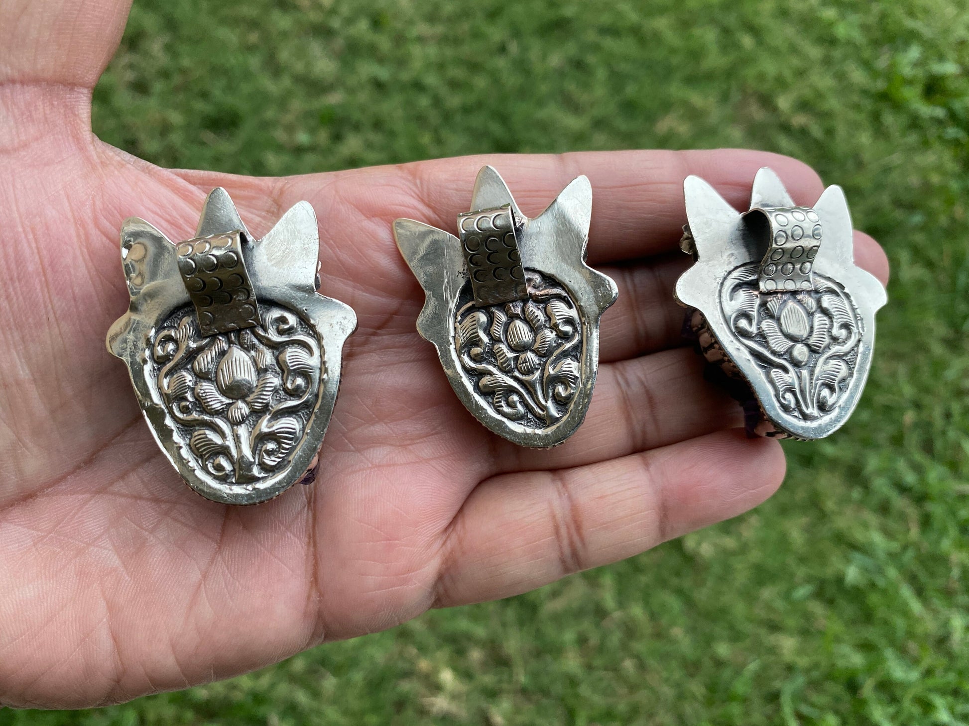 Measurement:Left Pendant: approximately Length 55 mm (measuring from bail to bottom), width 38 mm from the widest side, bail size: 8 mm and weighs about 33.20 gm.Center Pendant: approximately Length 50 mm (measuring from bail to bottom), width 33 mm from the widest side, bail size: 8 mm and weighs about 25.50 gm.Right Pendant: approximately Length 50 mm (measuring from bail to bottom), width 38 mm from the widest side, bail size: 8 mm and weighs about 29.40 gm.
