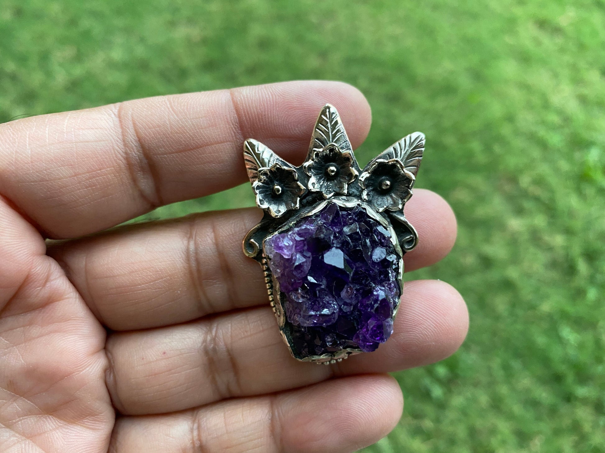 Made with Tibetan Silver & Raw Amethyst Druzy Pendant. Beautiful hand carved on the back. These are sure to make an impact on your jewelry project. This pendant would be a great addition to your necklace, would look great strung on beaded Necklace, Chain or Mala.Beauty and magic of this pendant that is unmatched as they are handmade and are one of a kind. With the nature of them being handmade, each product is unique in its own right and no two products are the exact same.