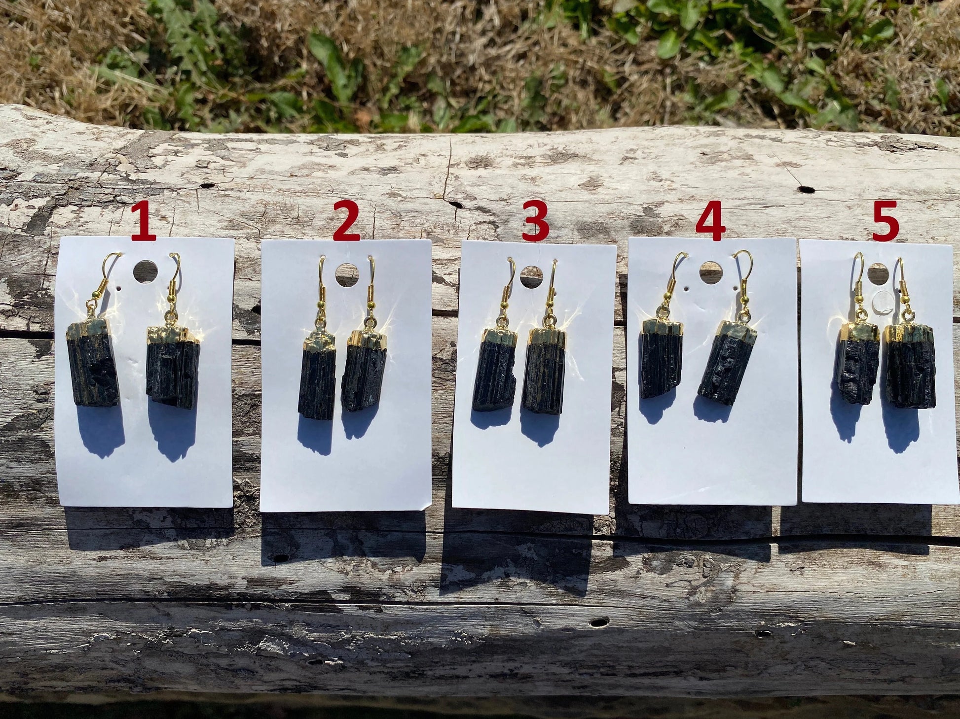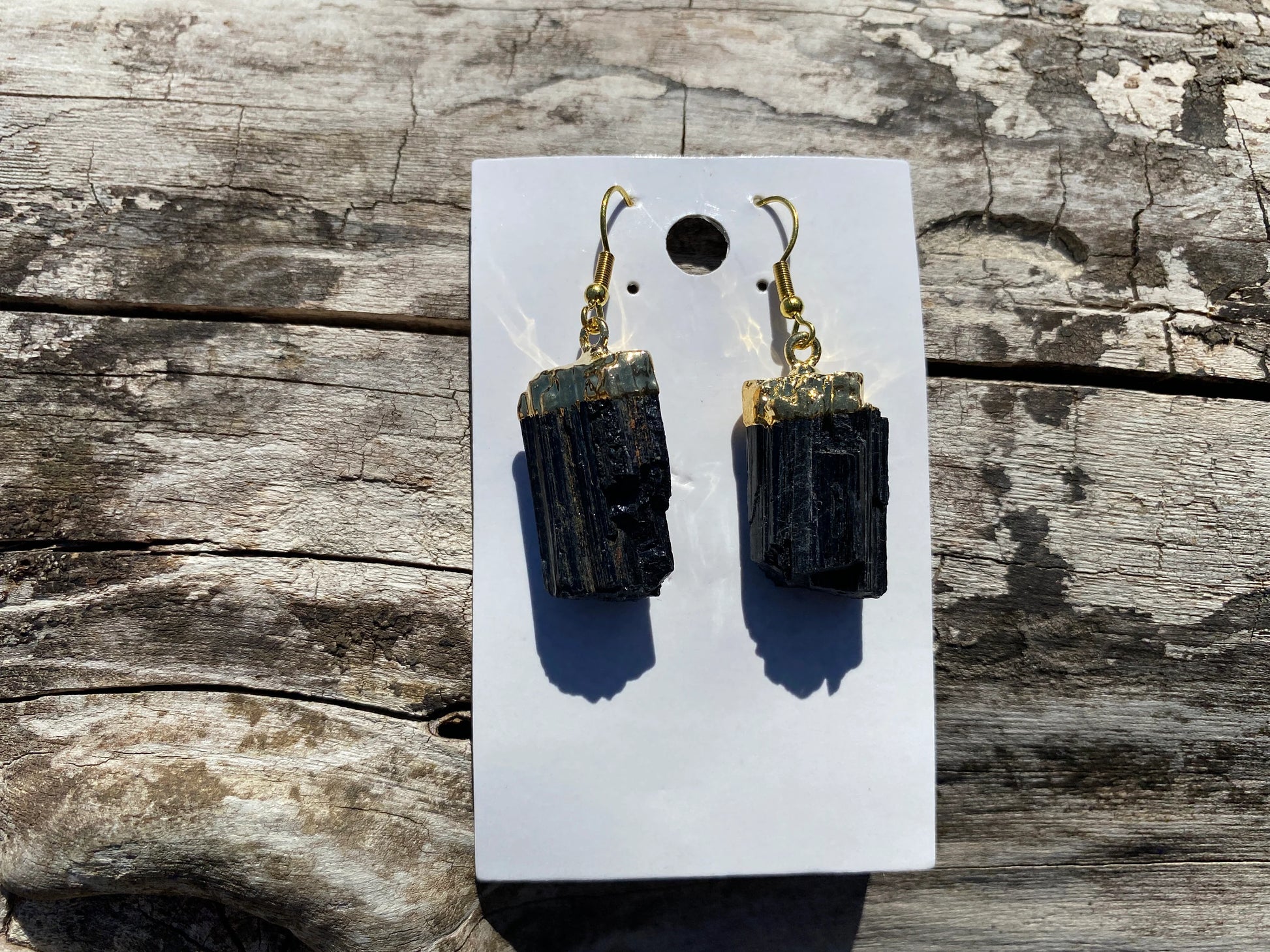 These Gold Electroplated Raw Black Tourmaline Earrings.