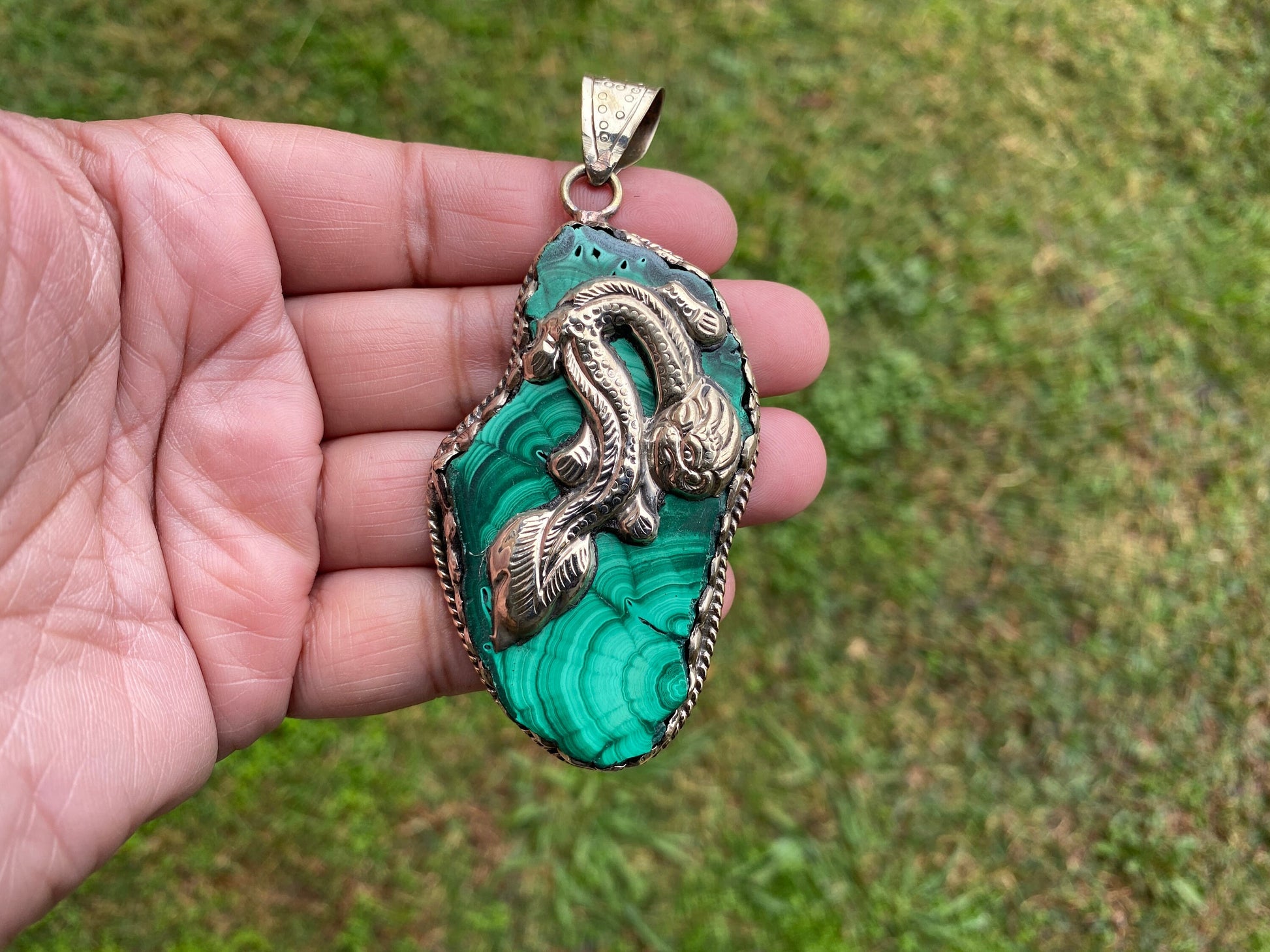 Raw Malachite Slab Natural Stone Tibetan Silver Pendant, Ethnic Jewelry, Energy Stone Pendant, Birthstone, Healing Crystal, Freeform Stone