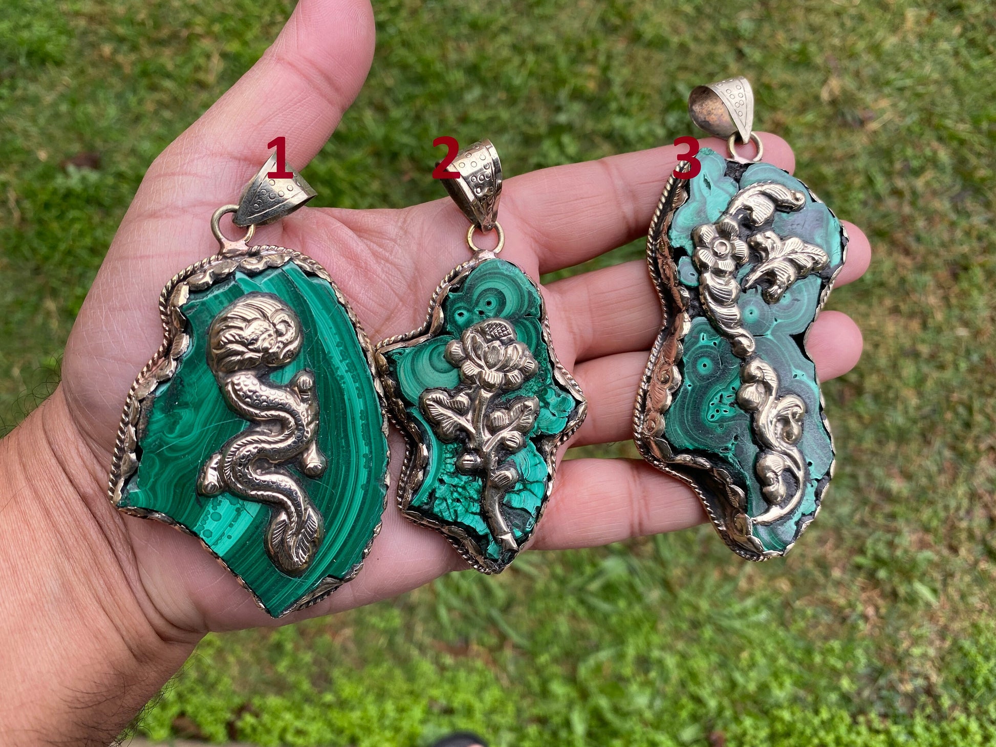Measurement: # 1 - Pendant: approximately Length 95 mm (measuring from bail to bottom), width 50 mm from the widest side, bail size: 12 mm and weight about 79.80 gm.# 2 - Pendant: approximately Length 90 mm (measuring from bail to bottom), width 40 mm from the widest side, bail size: 12 mm and weight about 57.00 gm.# 3 - Pendant: approximately Length 110 mm (measuring from bail to bottom), width 45 mm from the widest side, bail size: 12 mm and weight about 93.40 gm.Malachite is an important protection stone. Malachite absorbs negative energies and pollutants, picking them up from the atmosphere and from the body. Guards against radiation and clears electromagnetic pollution. Malachite clears and activates the chakras.Please Note: All crystal healing information provided is intended for spiritual guidance. It is not intended as a substitute for medical advice or service