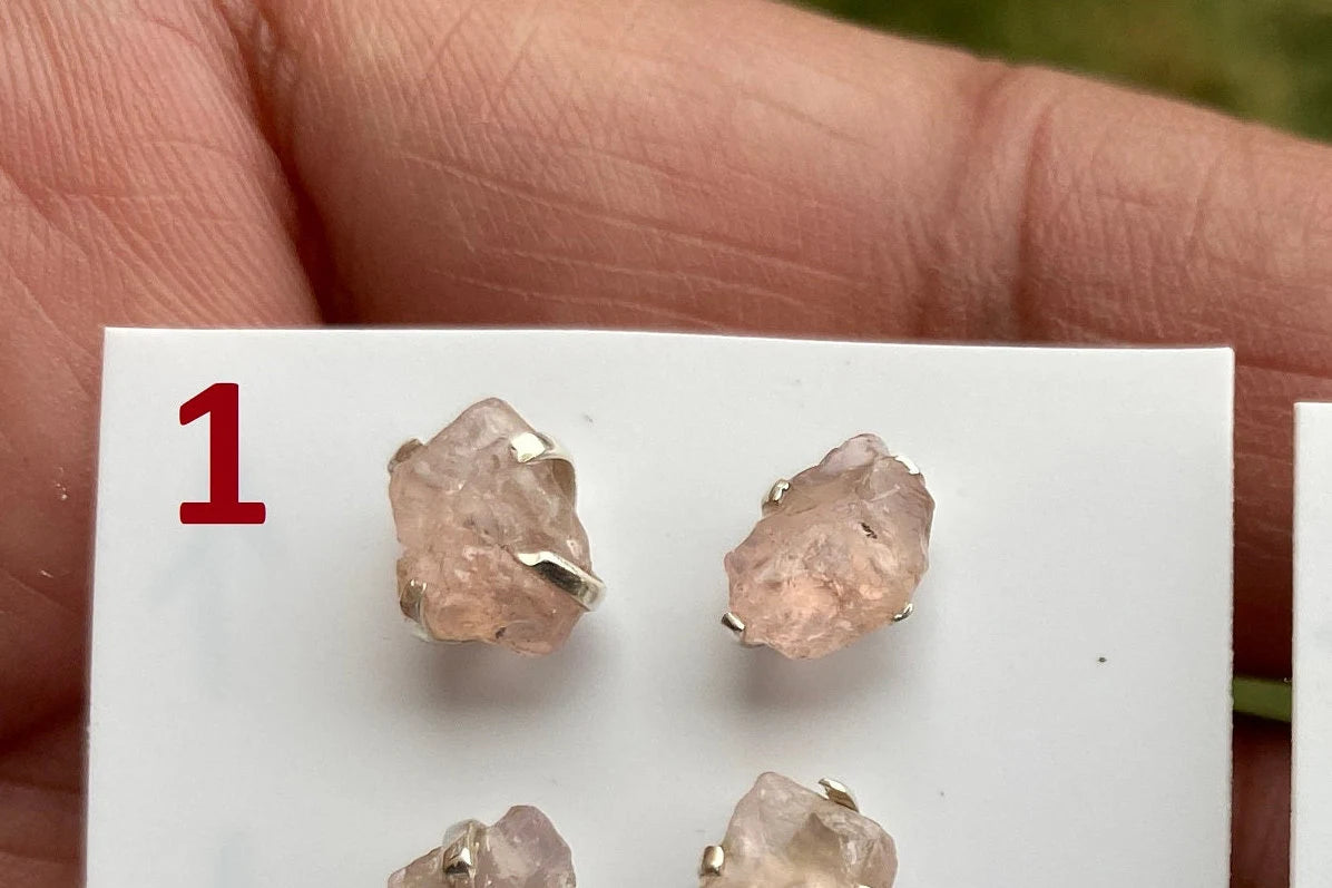 These raw Morganite gemstone ear studs made with 92.5 Sterling Silver Earring were handcrafted in Nepal. A unique gift for October Birthstone.
