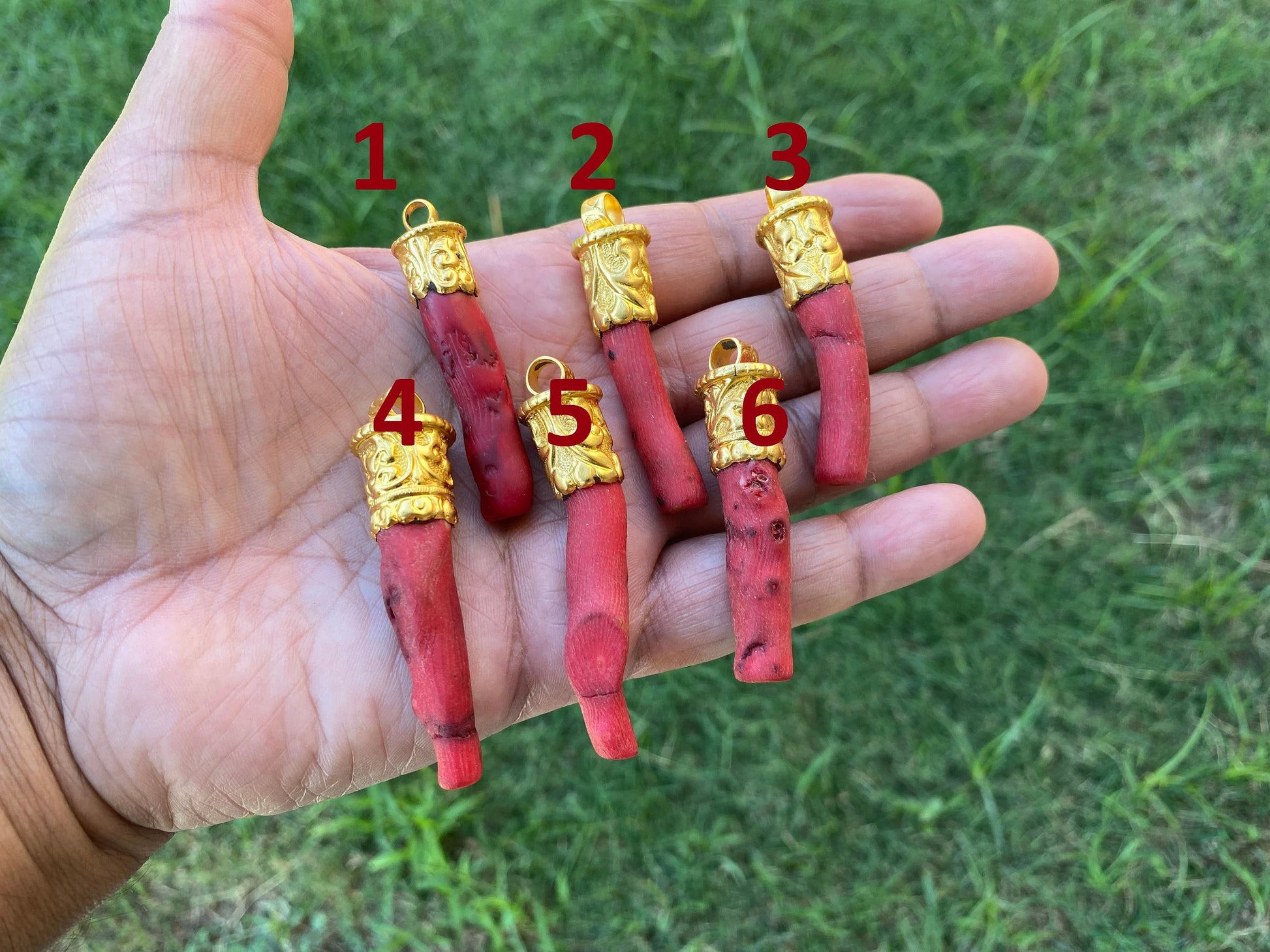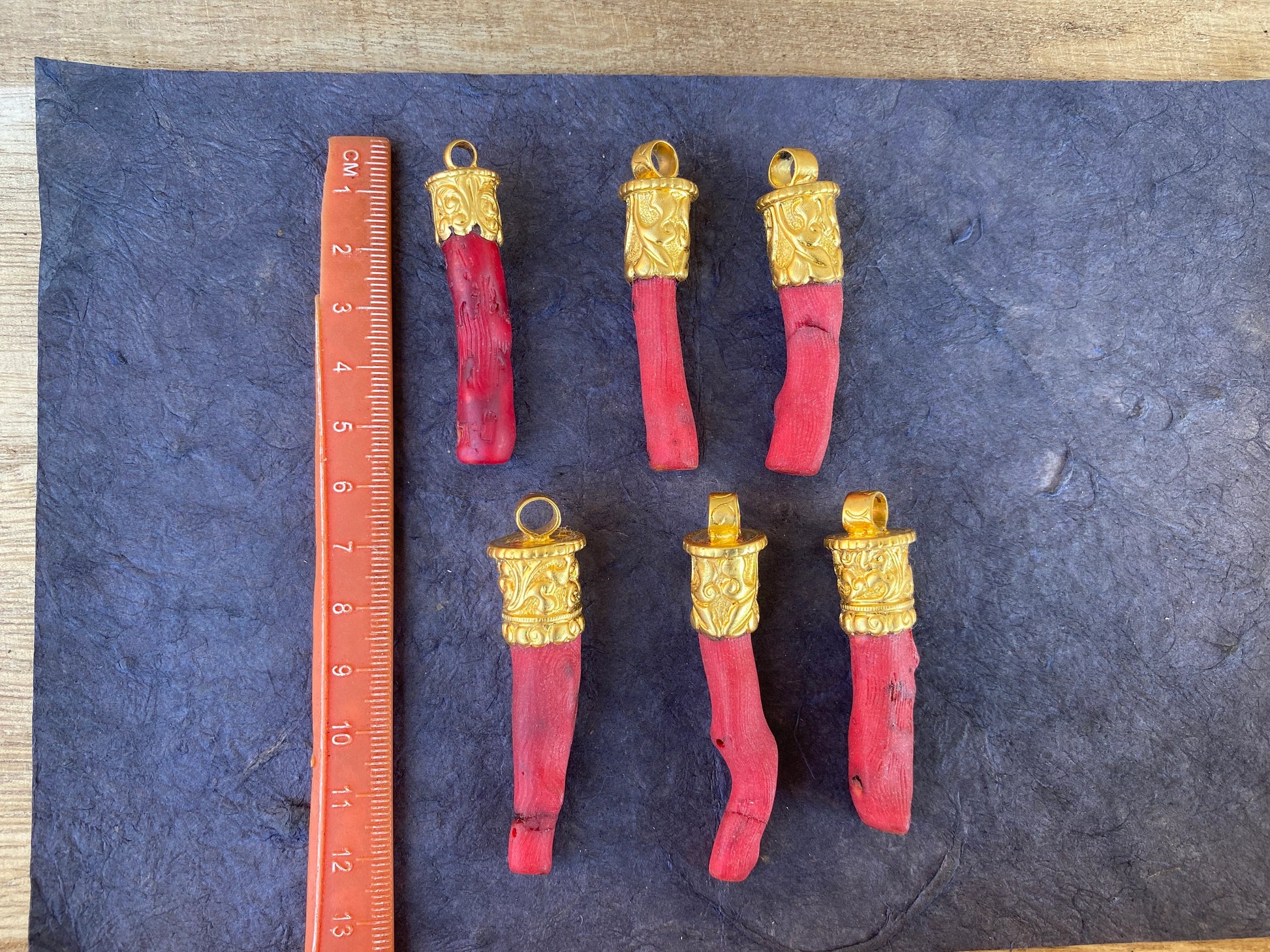 This listing is for 1 piece.At wholesale price!!! Measurement: approximately Length 55-65 mm (measuring from bail to bottom), width 13 mm from the widest side, bail size: 7 mm and weighs about 14.4 gm. The combination of matte gold and matte dyed coral is pretty...