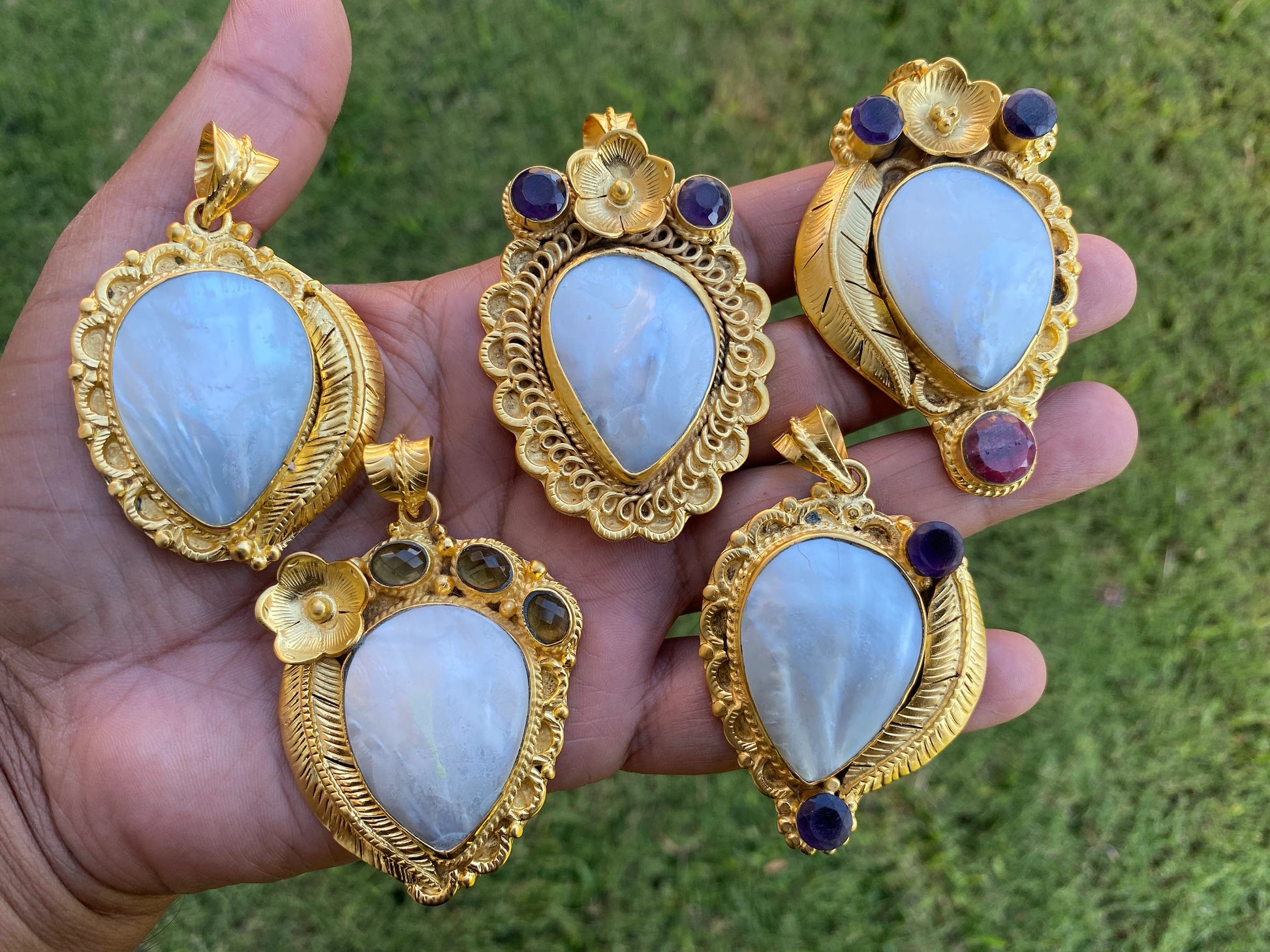 Gemstones:Top Left Pendant: Shell, Top Center: Shell & Amethyst, Top Right: Shell, Amethyst & Ruby, Bottom Left: Shell & Citrine, Bottom Right: Shell & Amethyst
