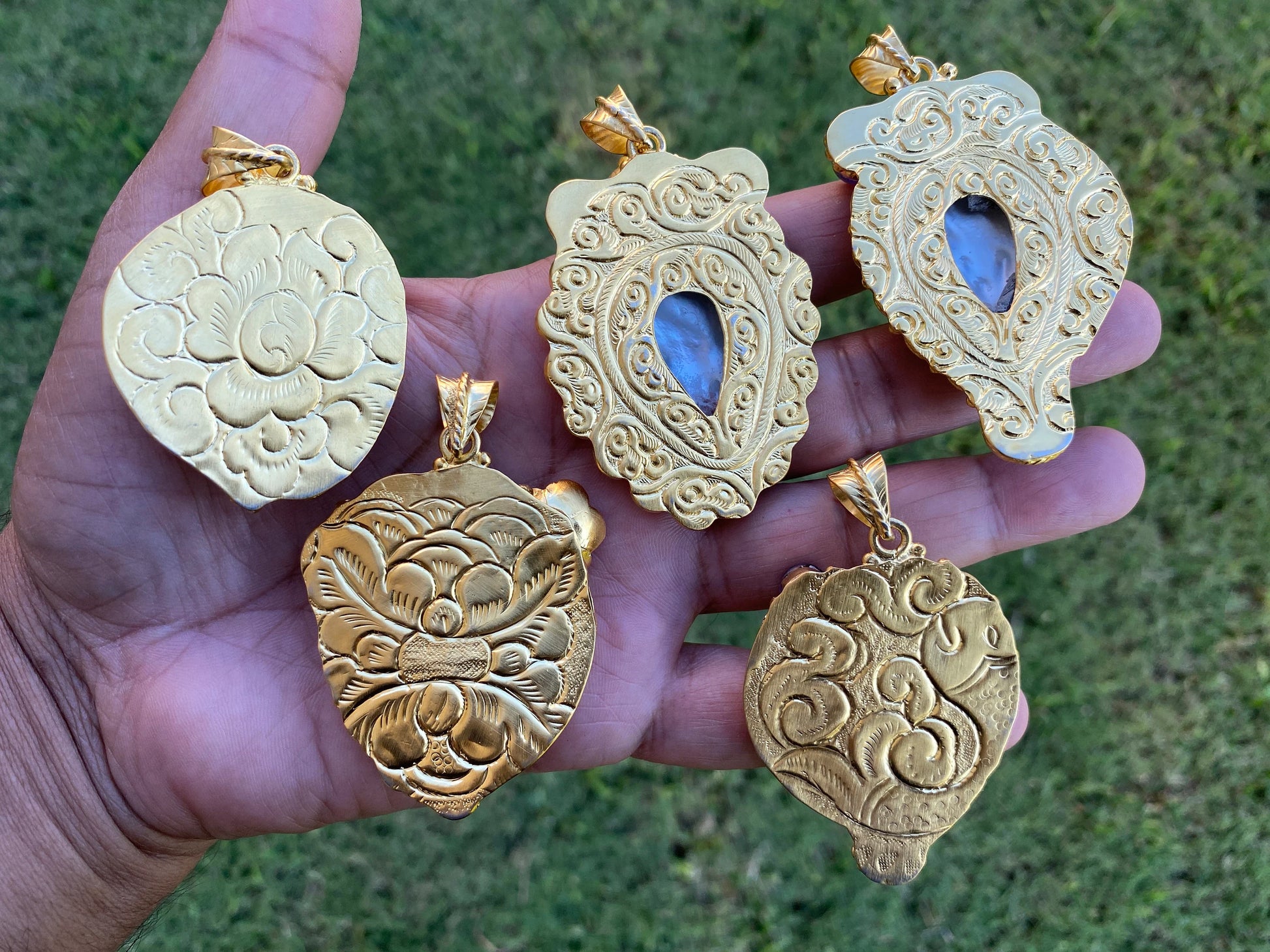 Listing is for 1 pendantWholesale Price!!!Measurement: approximately Length 60 mm (measuring from bail to bottom), width 45 mm from the widest side, bail size: 9 mm and weighs about 24.26 gm. The combination of matte gold with Gemstone pendant is pretty enchanting. This Ethnic designs...