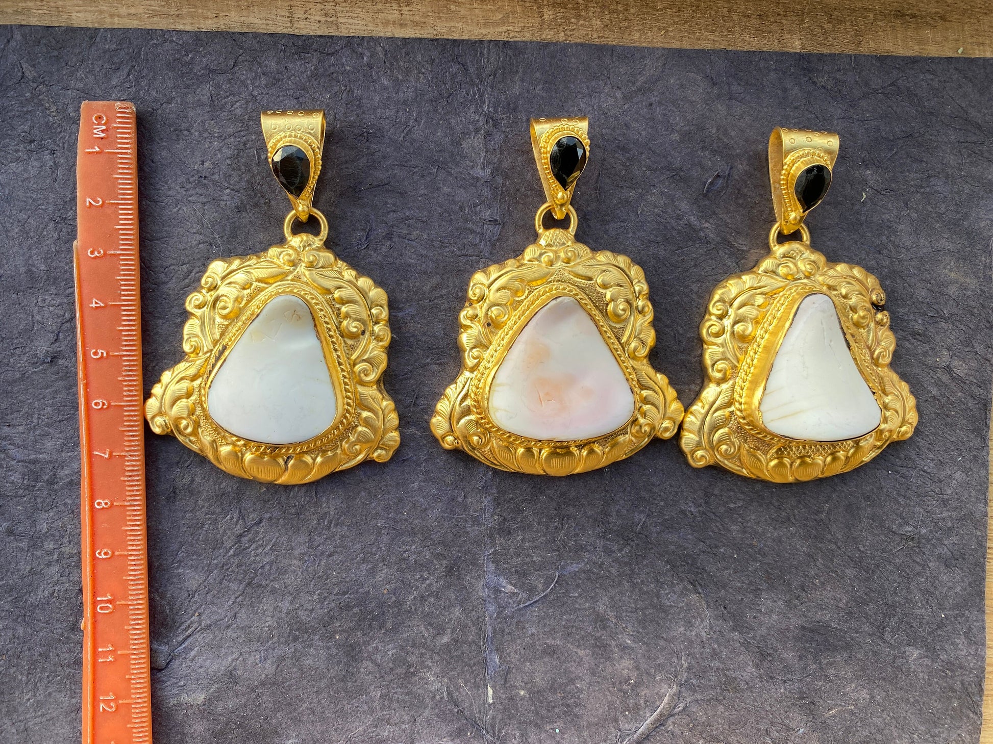 This listing is for 1 piece. At wholesale price!!! Jewelry from Nepal hand-carved Pendant made with Shell with Black Onyx Gemstone settings with 18K Brushed Gold Overlay over Brass Non Tarnish. These pendants are sure to make an impact on your jewelry project. These Products...