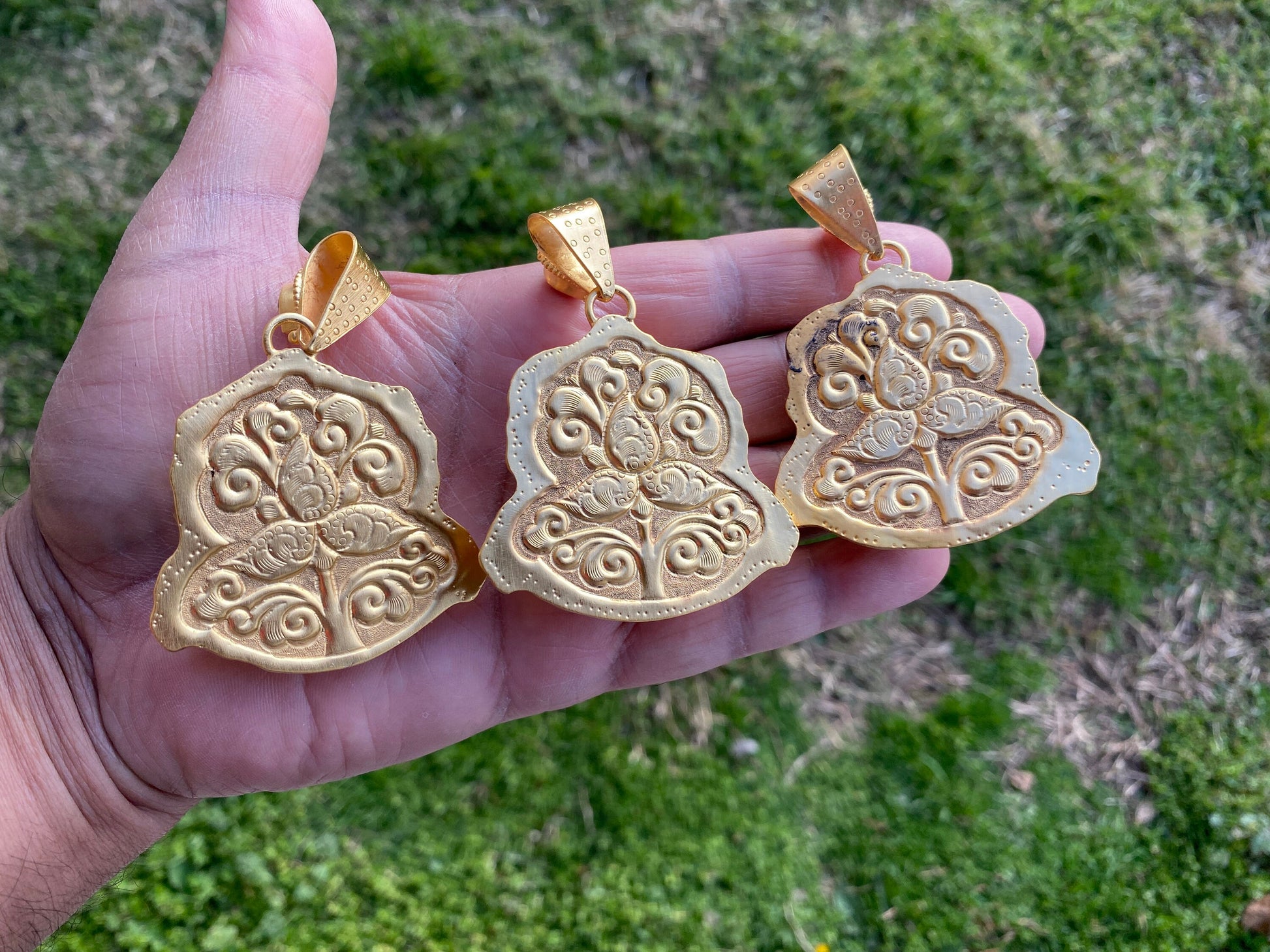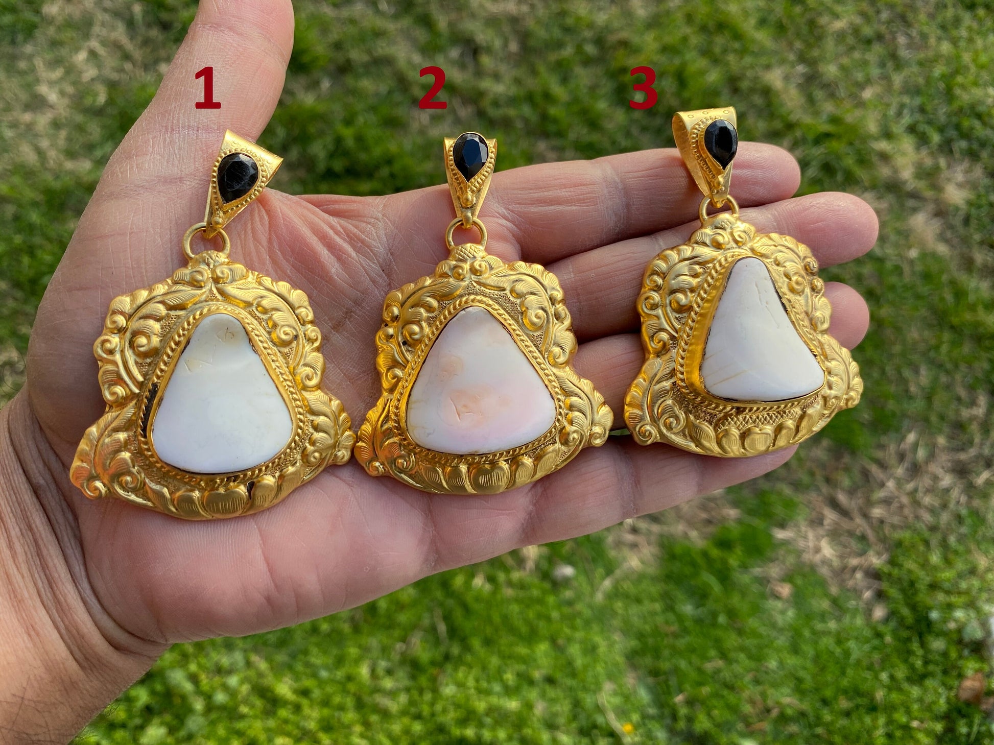 Jewelry from Nepal hand-carved Pendant made with Shell with Black Onyx Gemstone settings with 18K Brushed Gold Overlay over Brass Non Tarnish. These pendants are sure to make an impact on your jewelry project. These Products would be a great addition to your necklace project. This Pendant would look great strung on beaded necklace .chain or Malas.The pendant has a beautiful carving design in the back and the large hanging hole of 10 mm allows you to add thicker threads and leather. The pendant is very lightweight .These Ethnic pendants have a beauty and magic to them that is unmatched as they are handmade in Kathmandu, Nepal and are one of a kind. With the nature of them being handmade, each product is unique in its own right and no two products are the same.