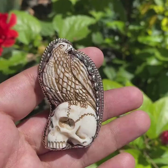 This stunning hand carved Eagle and skull in buffalo bone with Tibetan silver ring is sure to realize your vision of going boho and hippie style. This ring is equally beautiful on the rear side as it is on the front. The back side of...